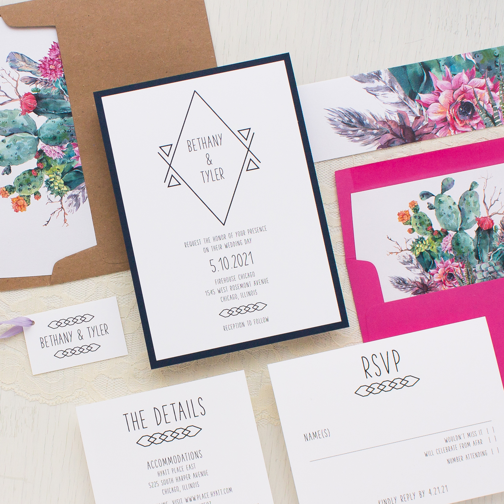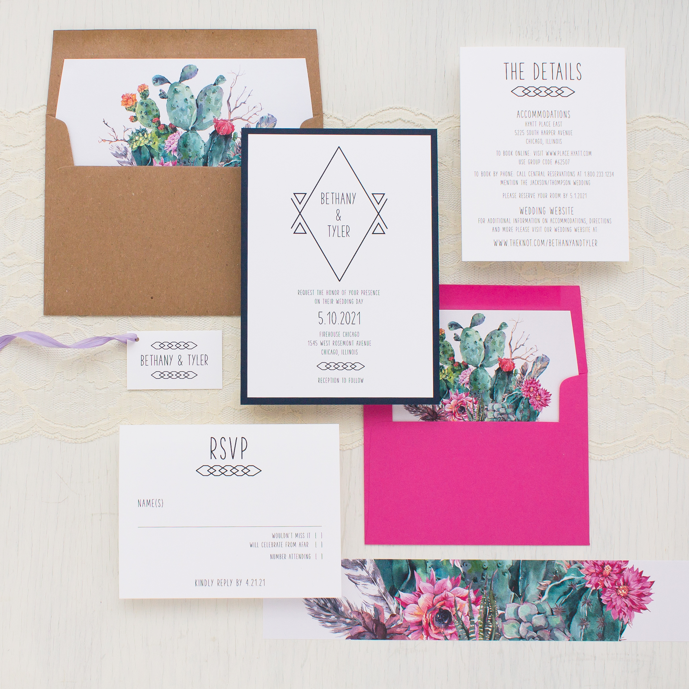 Bright and bold geometric cactus wedding invitations. Colorful cactus graphics with floral blooms, pink, kraft, navy blue and lavender. Simple typographic fonts and personalized geometric monogram on white paper creates a boho classic/modern look.