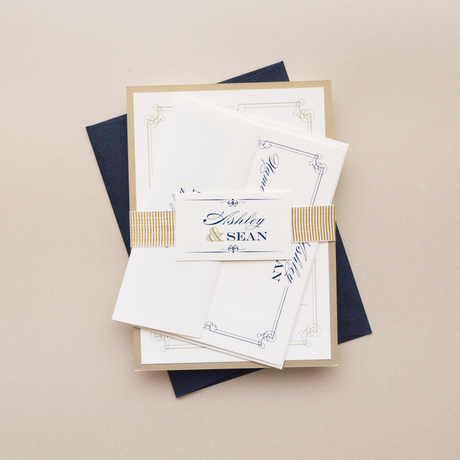 These navy & gold wedding invitations are luxurious, tastefully refined and oh so elegant. Classic fonts with layers of navy, ivory and gold create a simple and traditional look. A gold ribbon ribbon offers just the right amount of glam. Perfect for your sophisticated soiree in any season!
