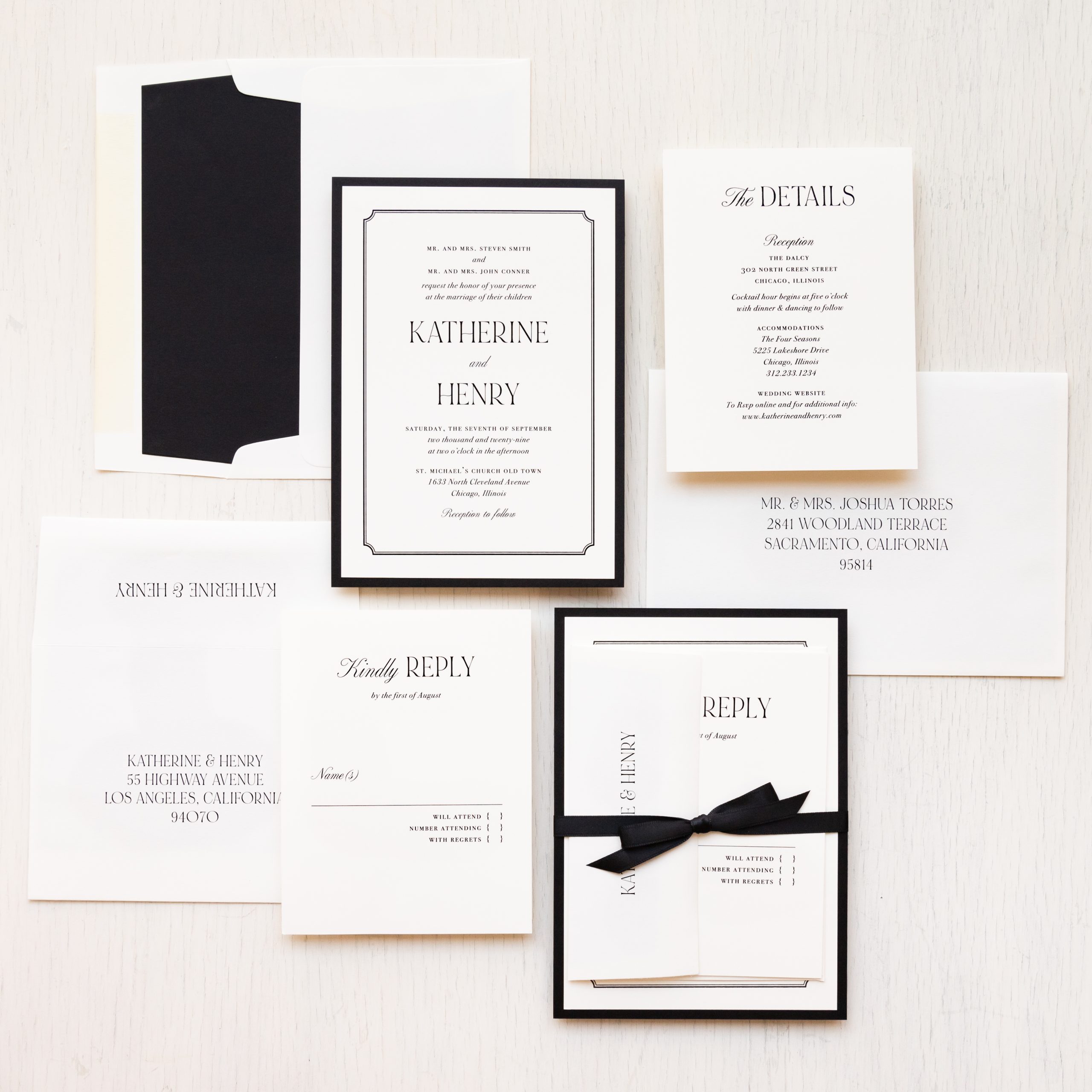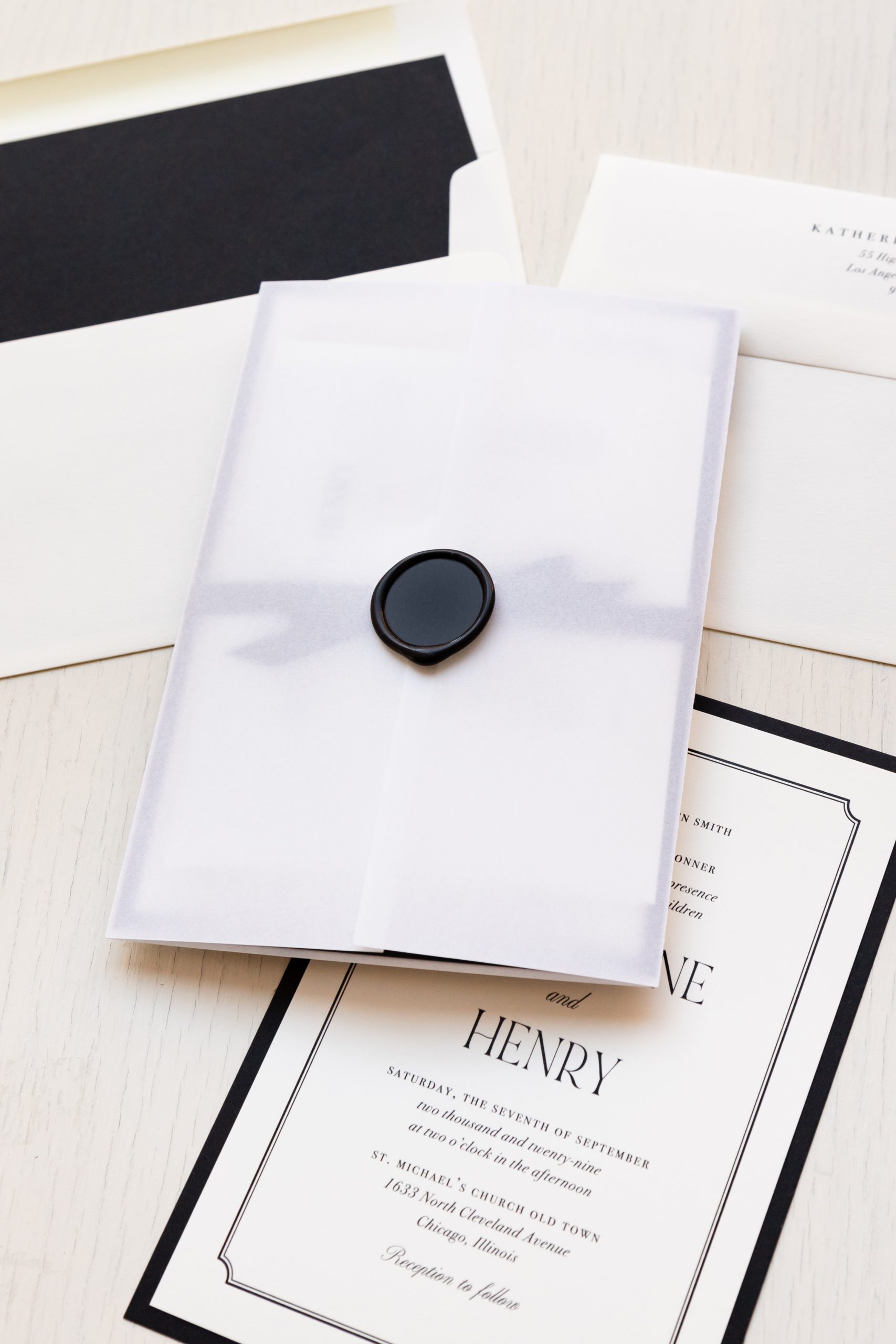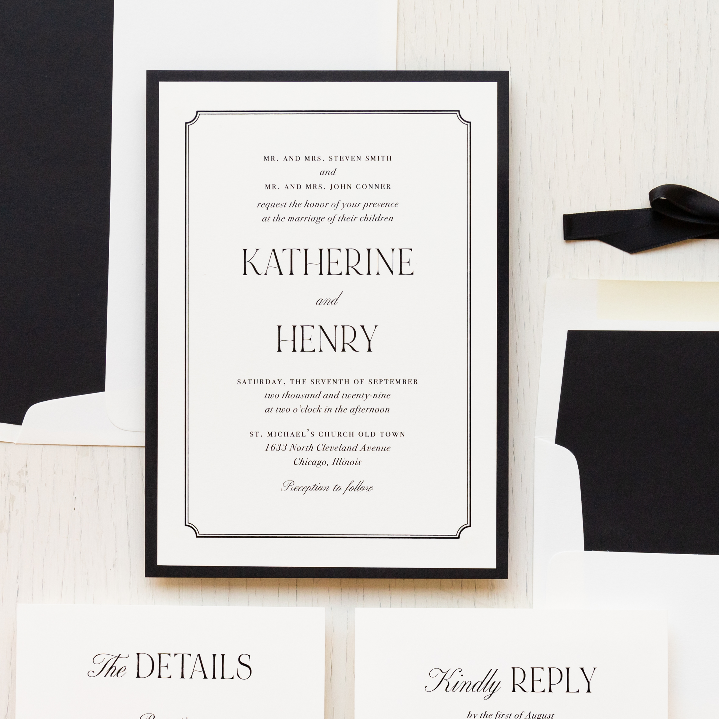 Black & cream wedding invitations layered with simple fonts, ivory envelopes and soft ivory paper. Black envelope liners add just a touch of elegance. Simple and minimalist, they set an modern tone for your black tie wedding.