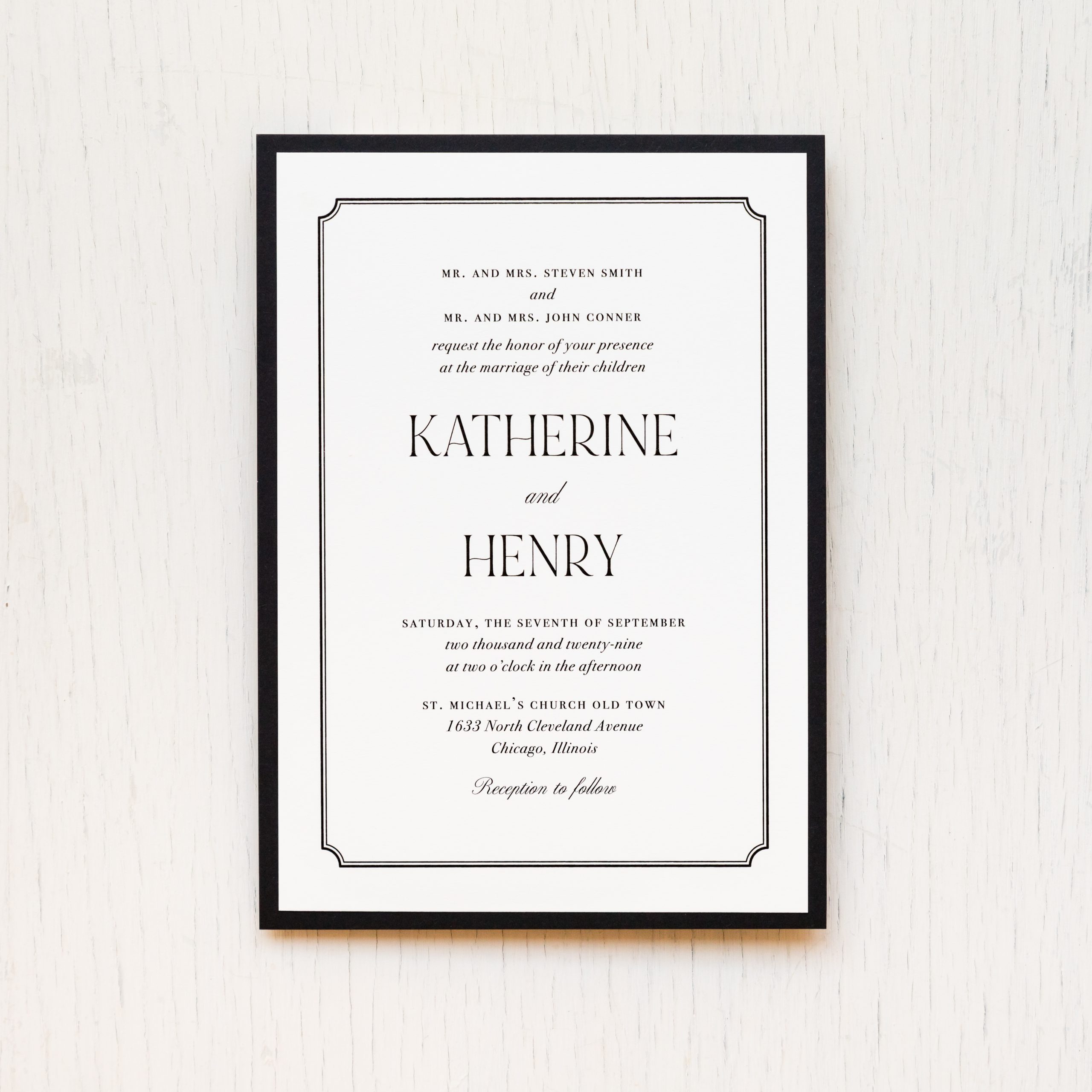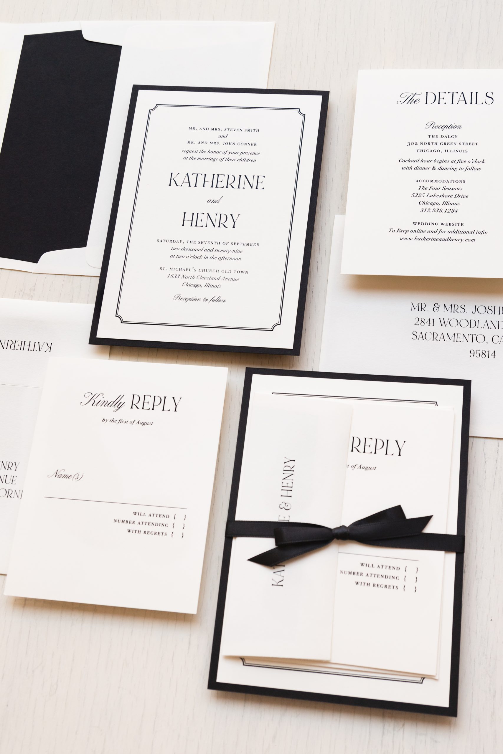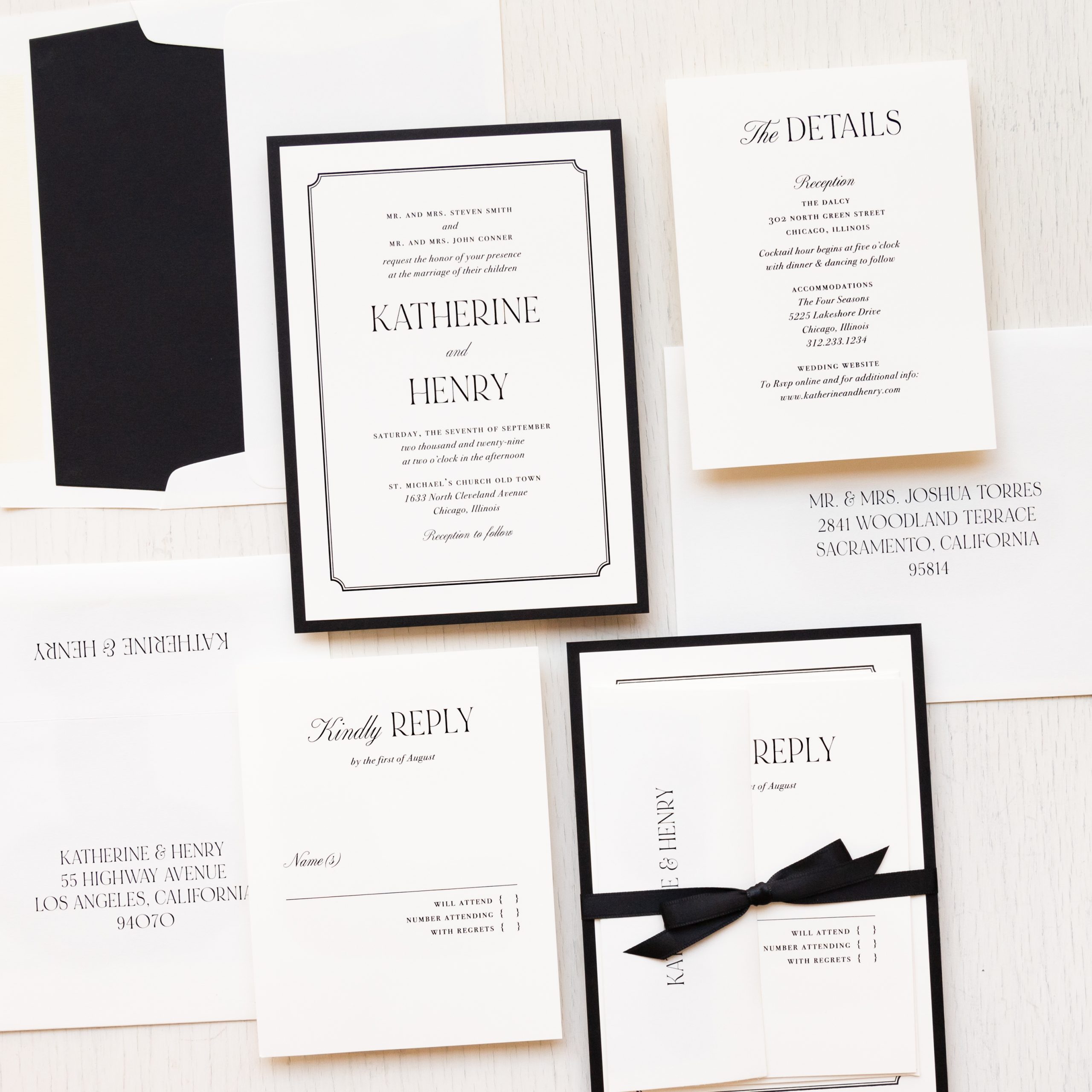 Black & cream wedding invitations layered with simple fonts, ivory envelopes and soft ivory paper. Black envelope liners add just a touch of elegance. Simple and minimalist, they set an modern tone for your black tie wedding.