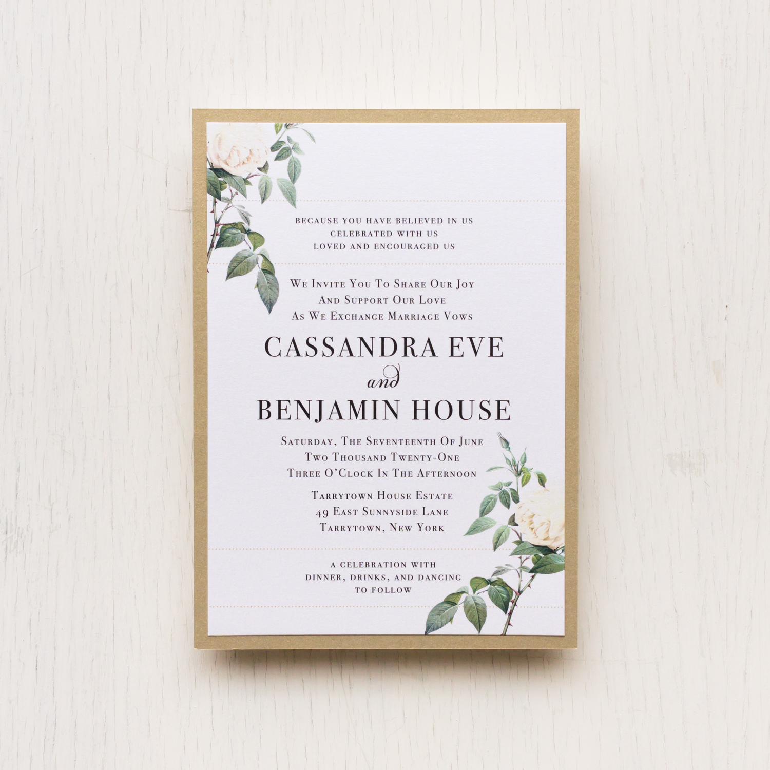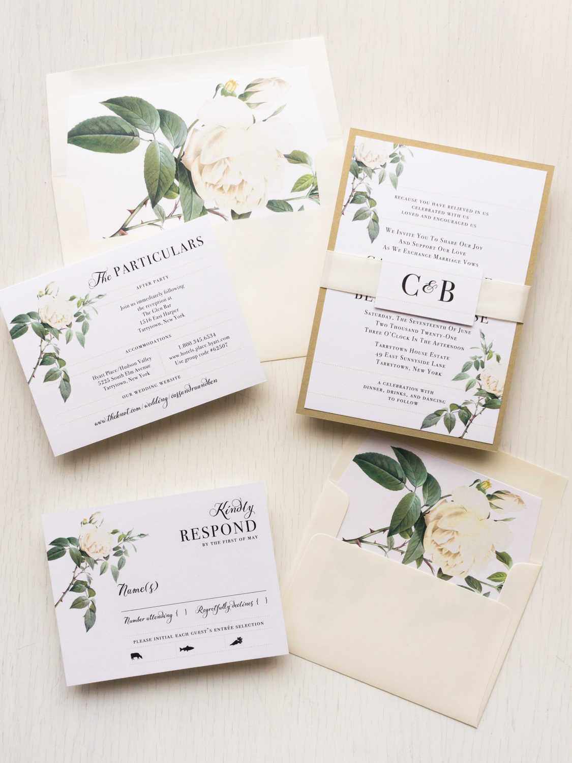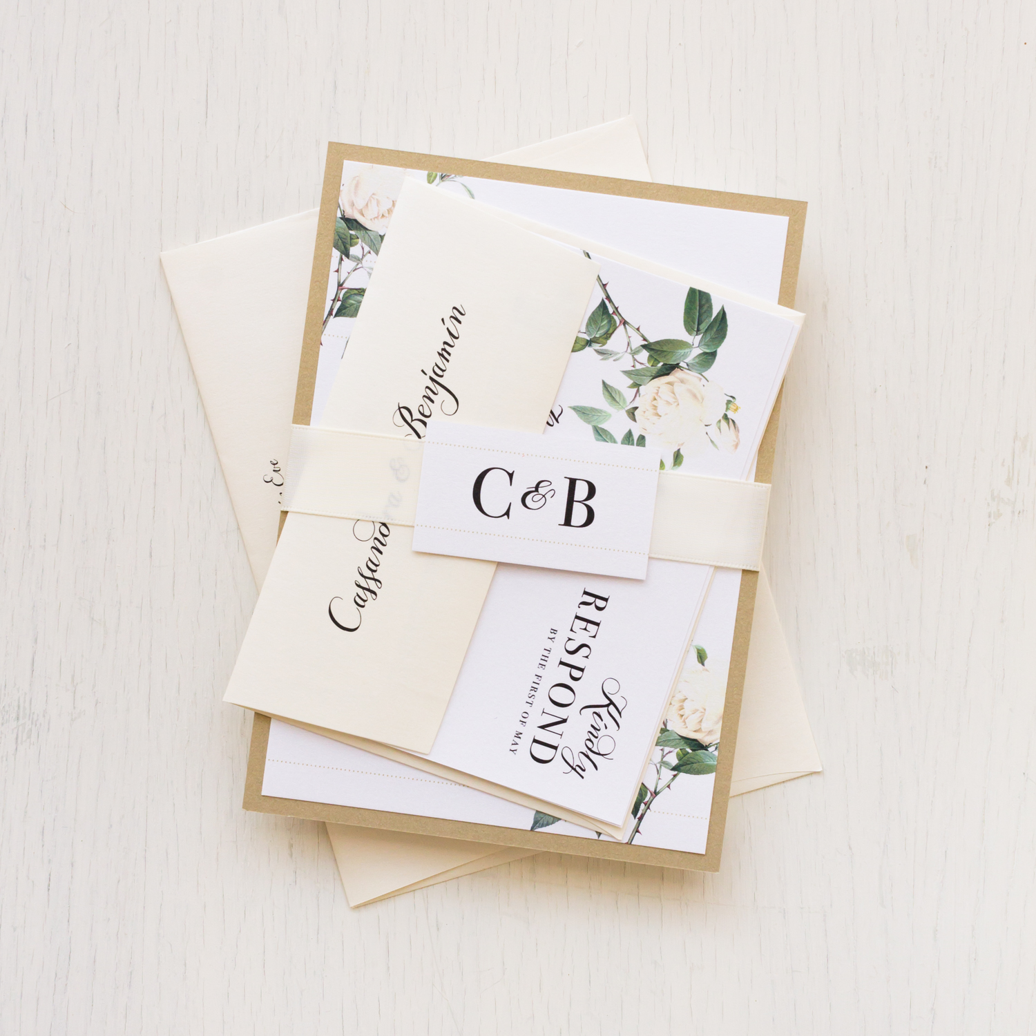 With a mix of vintage florals and elegant scripts, these Ivory & White Floral Wedding Invitations have just the right amount of romance. They’re inspired by an elegant garden wedding with roses, greenery and neutral tones. Each set is paired with shimmery white paper, a champagne guest envelope, gold backing paper and then wrapped with a monogramed satin ivory ribbon belly band.