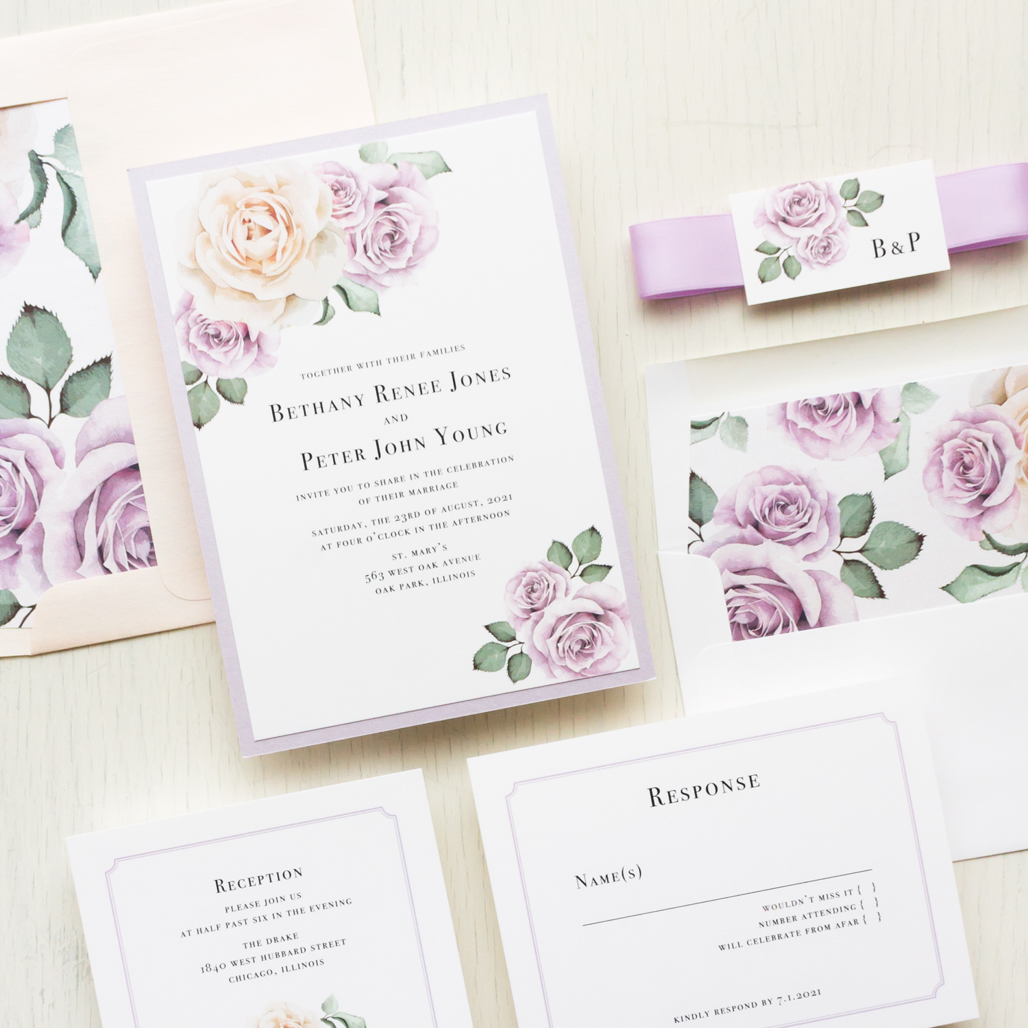 Lavender blush wedding invitations featuring mauve and ivory flowers and simple clean fonts. Paired with a blush peach metallic guest envelope and a simple lilac ribbon belly band, these little cuties are sure to delight your guests! They’re perfect for an outdoor garden wedding.