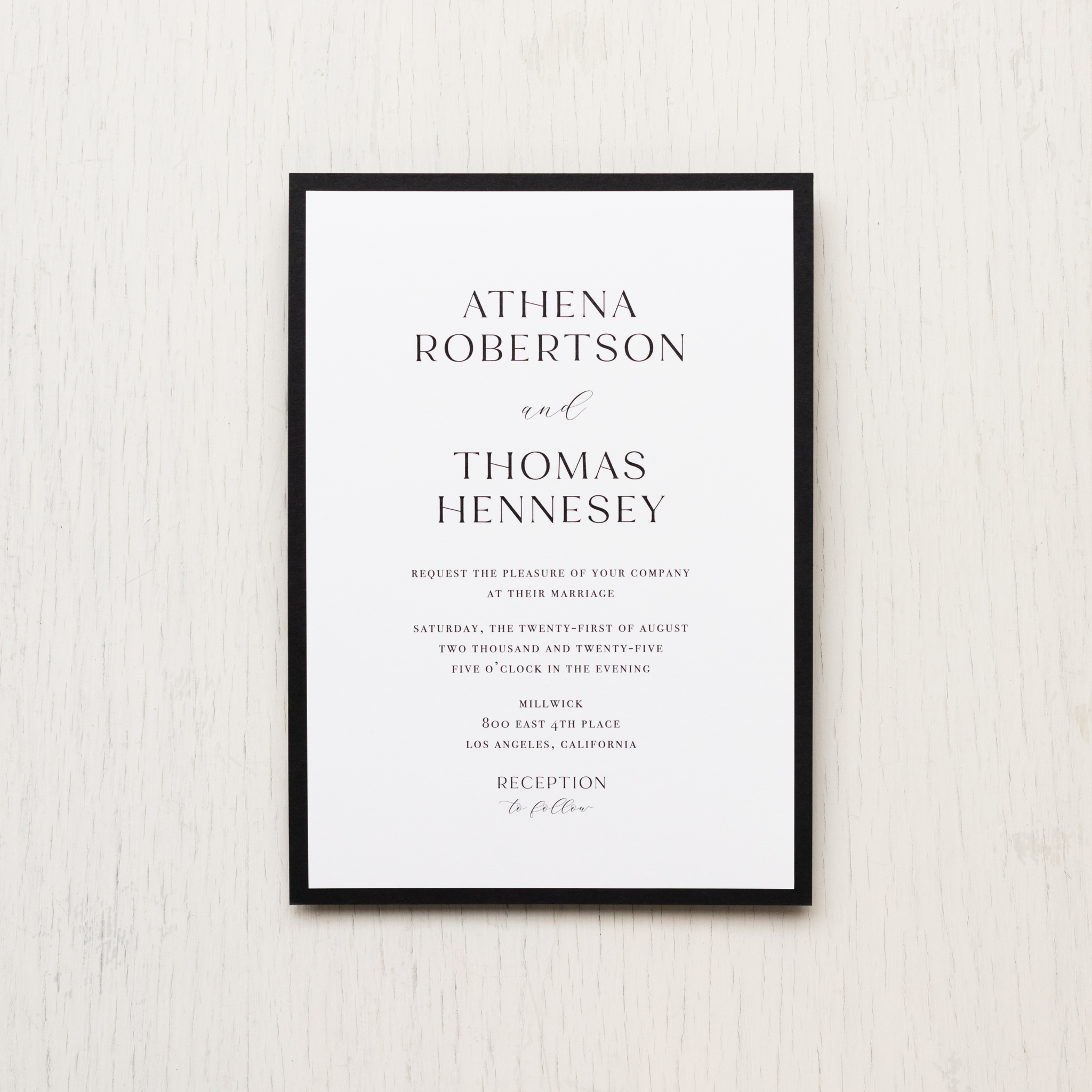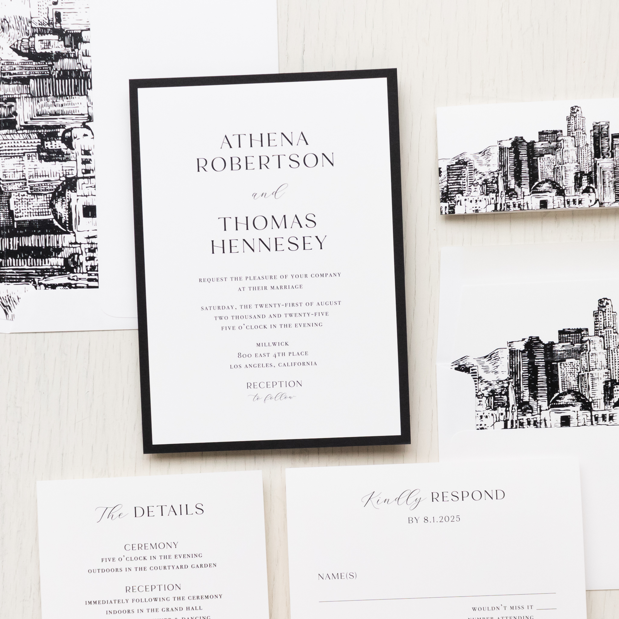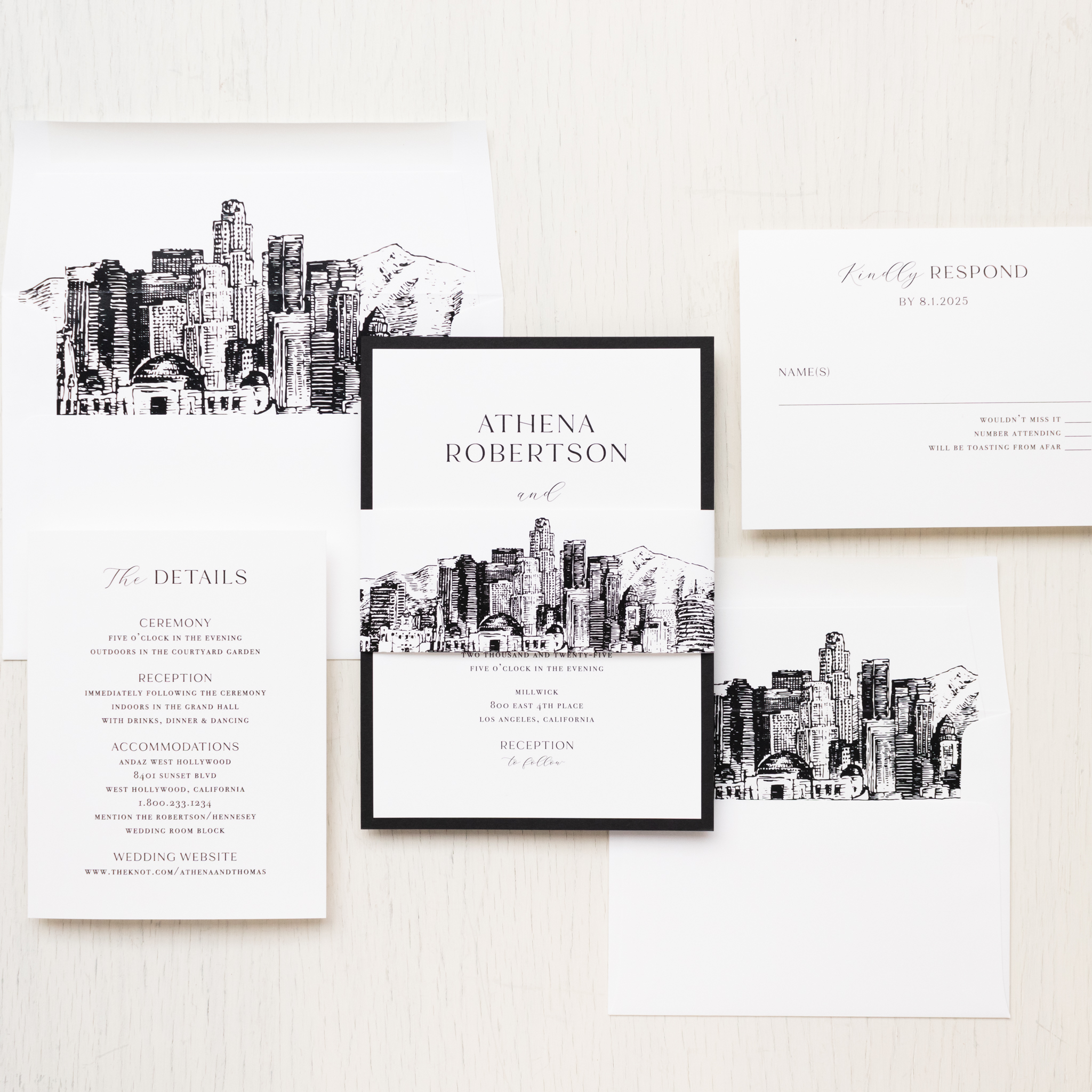 Los Angeles skyline wedding invitations layered with bold fonts, bright white paper and black accents. Black & white LA skyline envelope liners and paper band complete the theme. Simple and minimalist, they set a modern tone for your LA wedding!