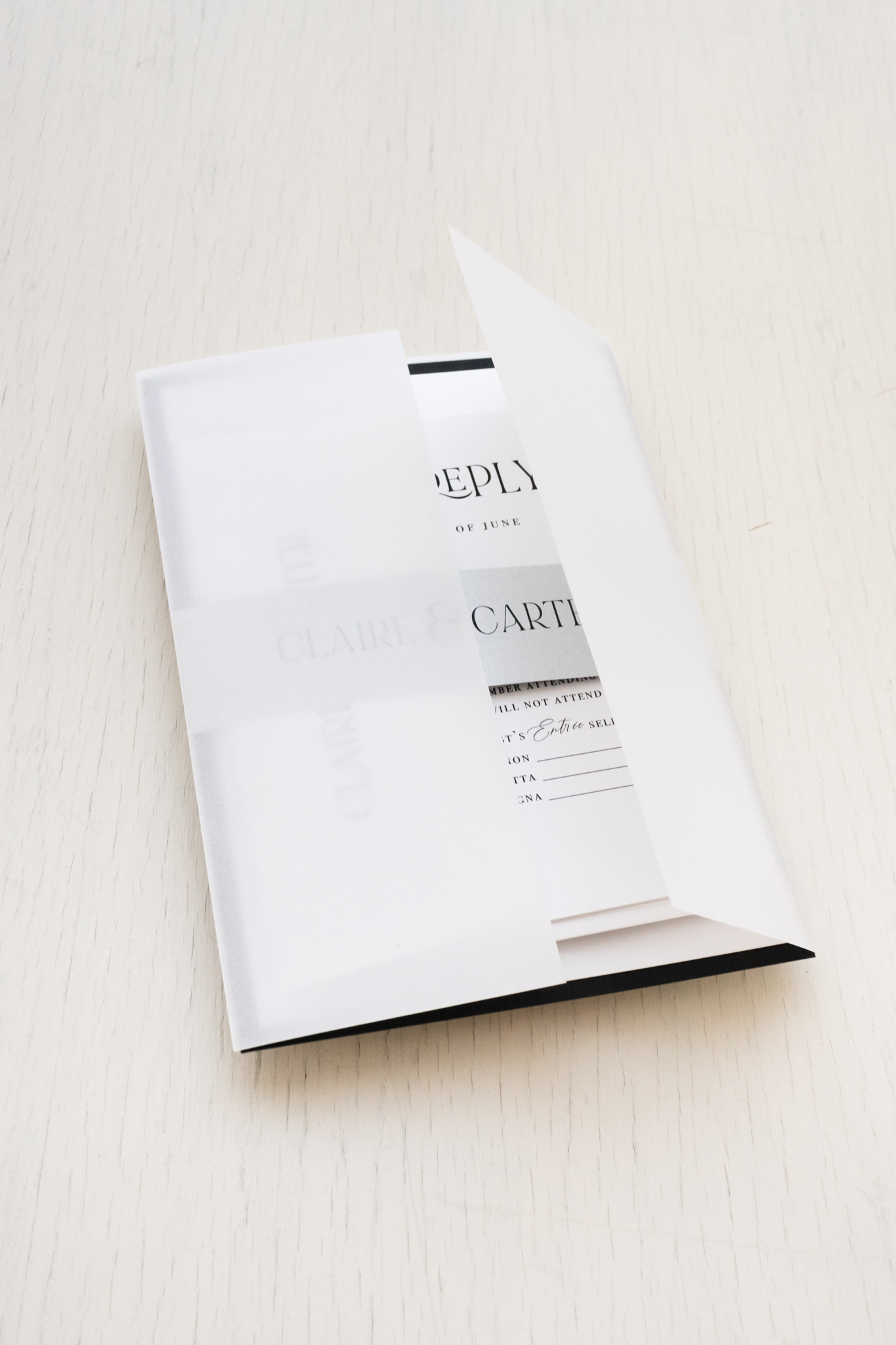 - RSVP envelope: white metallic