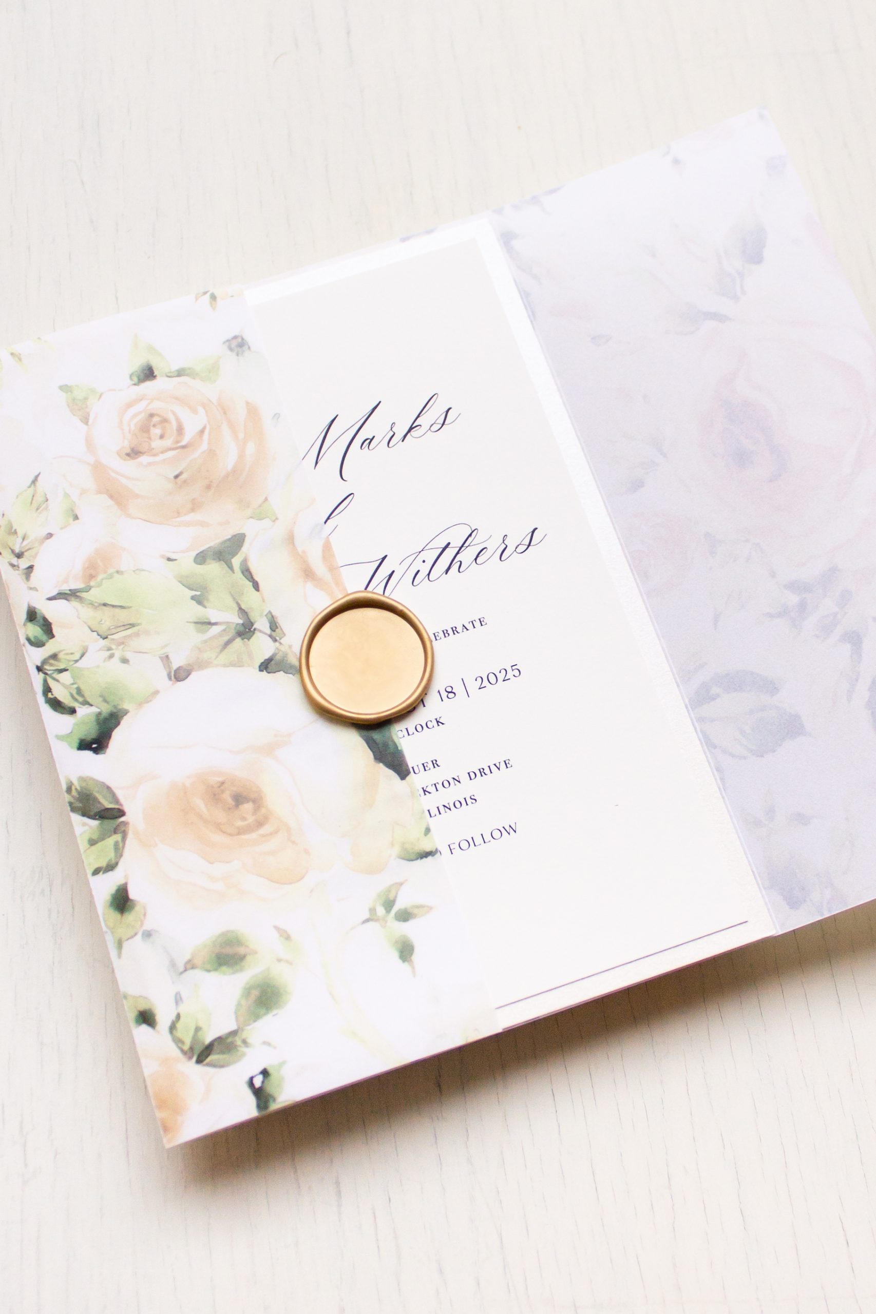 Ivory greenery vellum wedding invitations layered with painted florals, calligraphy fonts and soft ivory paper. Sleek and classy, they set an elegant tone for your sophisticated nuptials.
