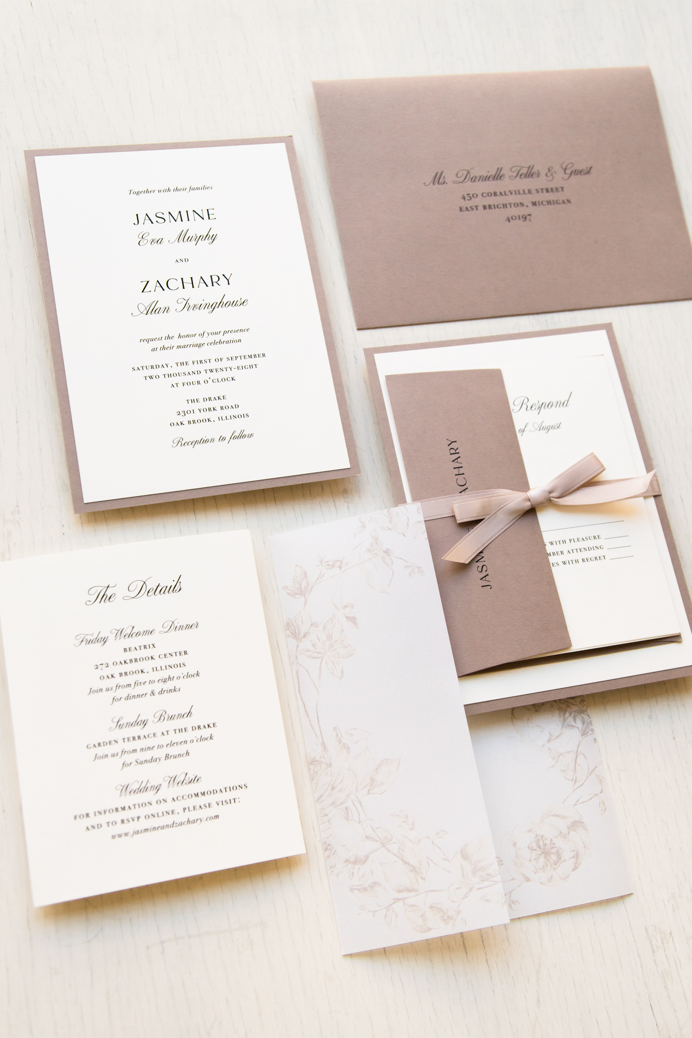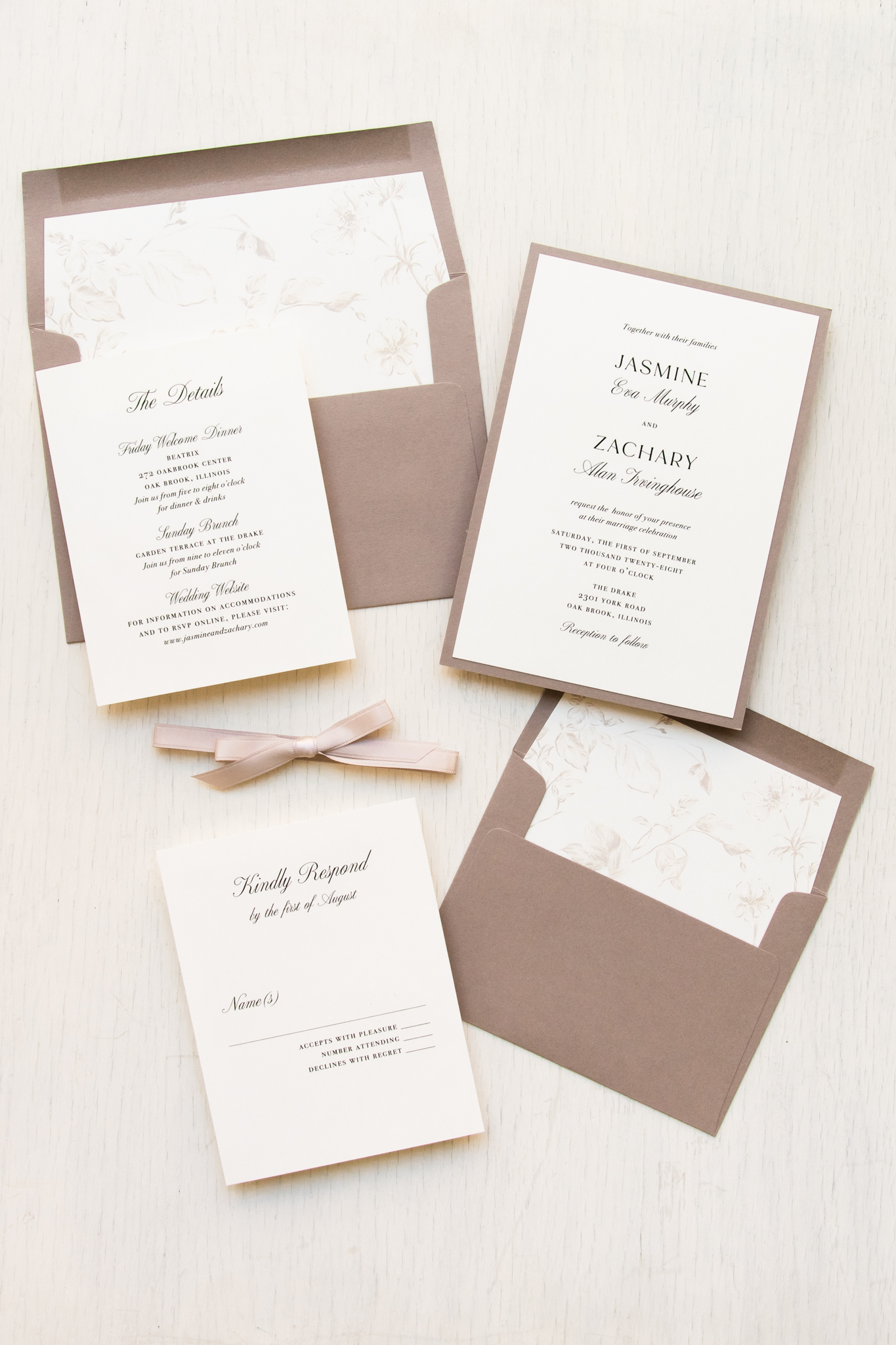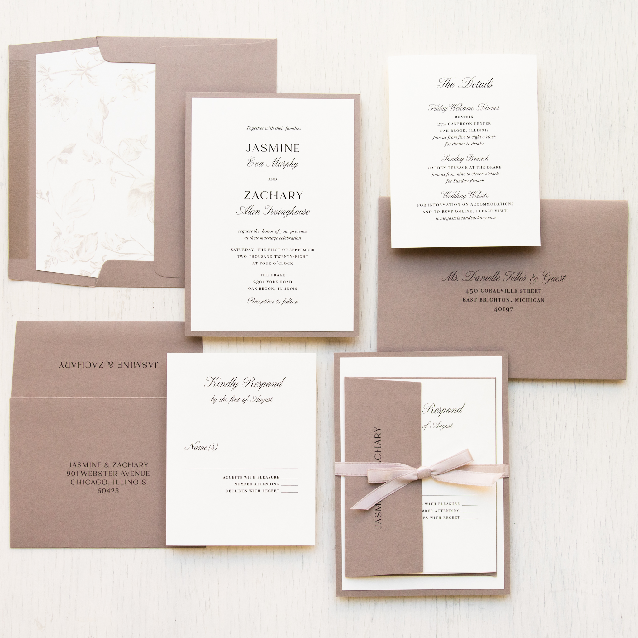 - RSVP envelope: dusty beige solid