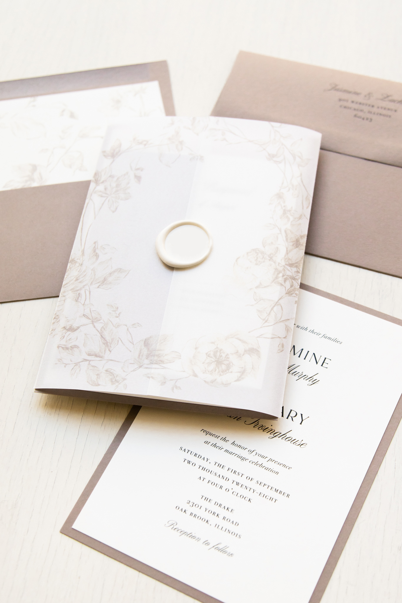 Neutral wedding invitations layered with simple fonts, beige envelopes and soft ivory paper. Vintage floral envelope liners add just a touch of romance. Simple and classic, they set an elegant tone for your wedding day.
