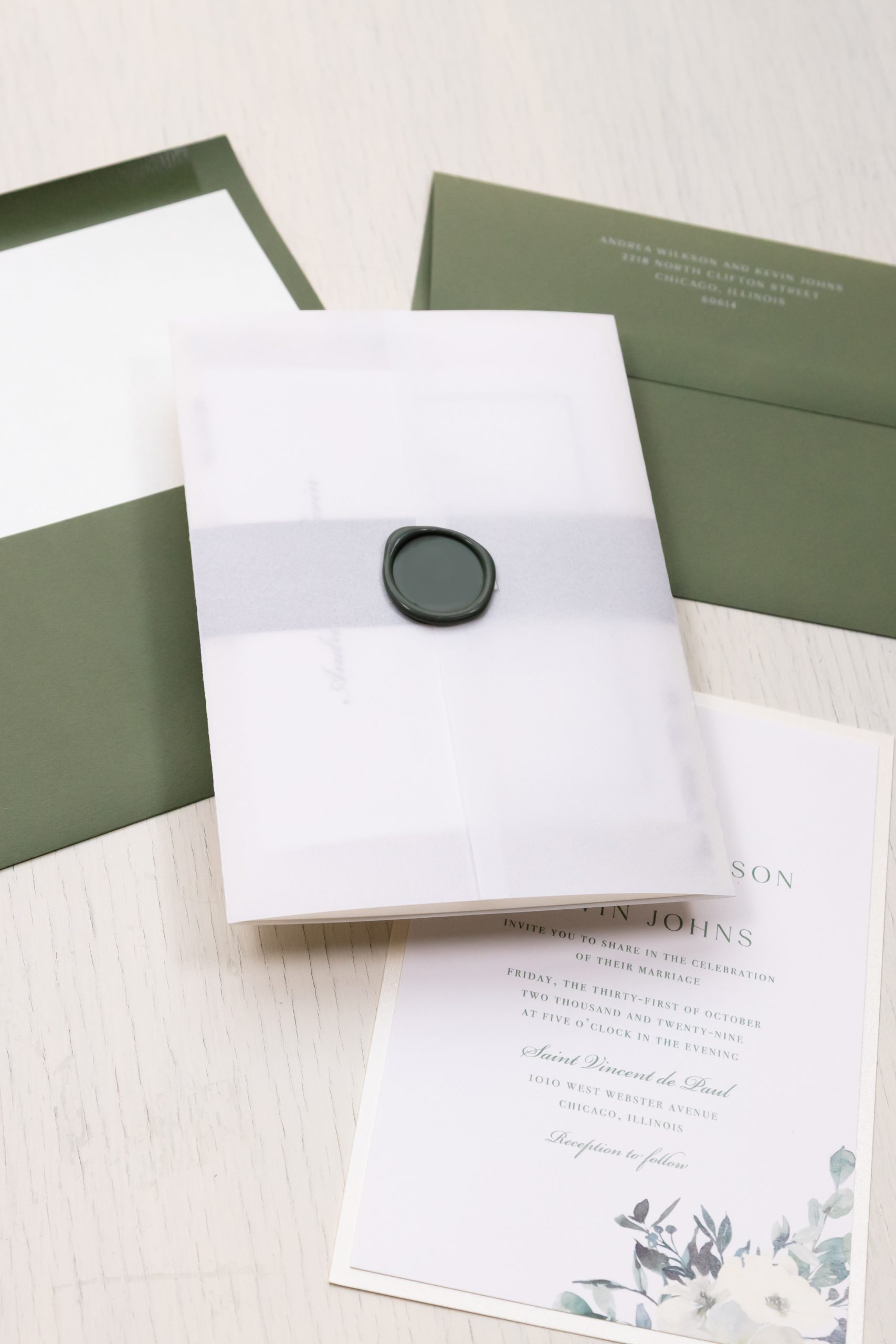 Stylish and modern Olive Floral wedding invitations with a ivory florals, olive envelopes and formal fonts. Work with a live designer to customize wording, fonts, materials, and colors until you are 100% happy!