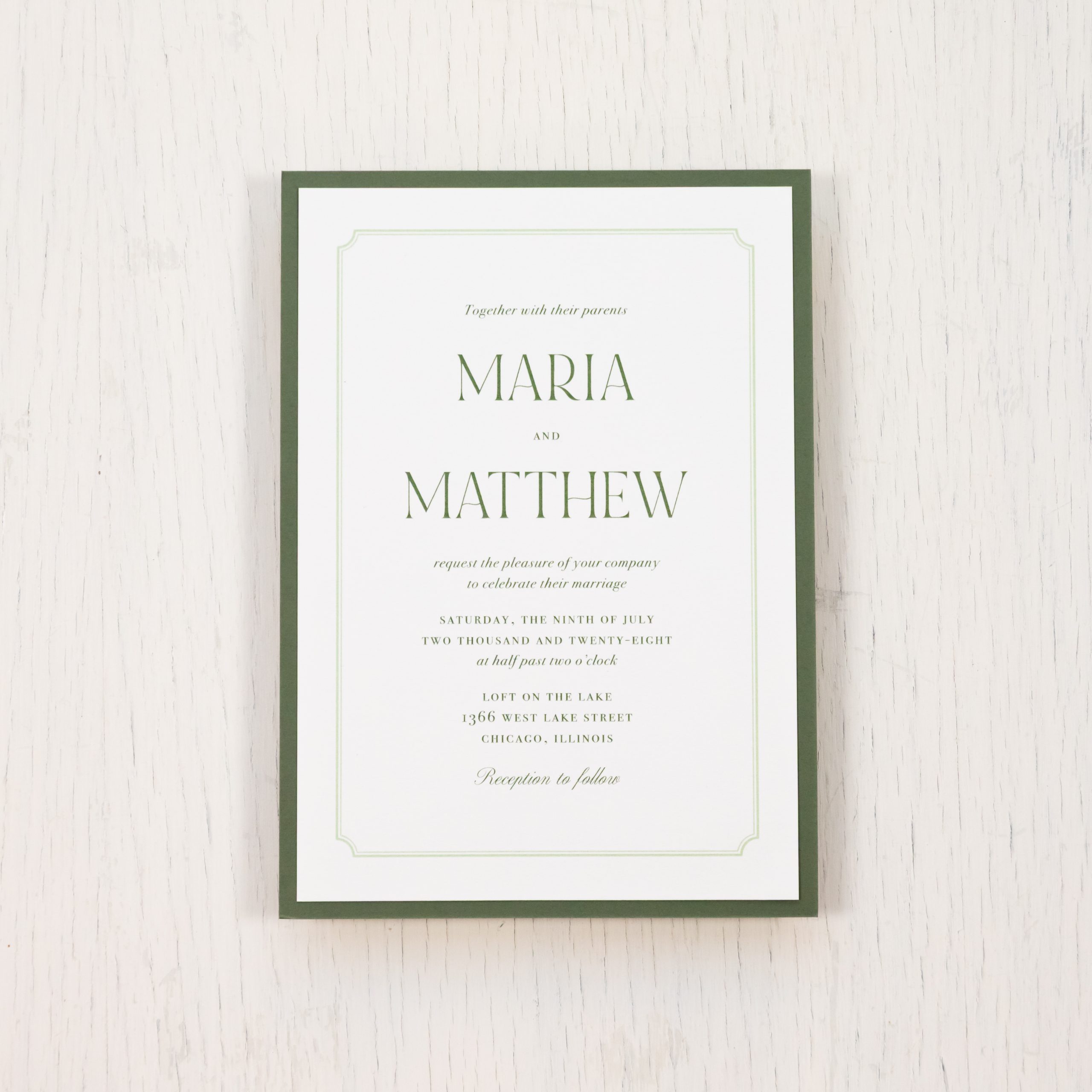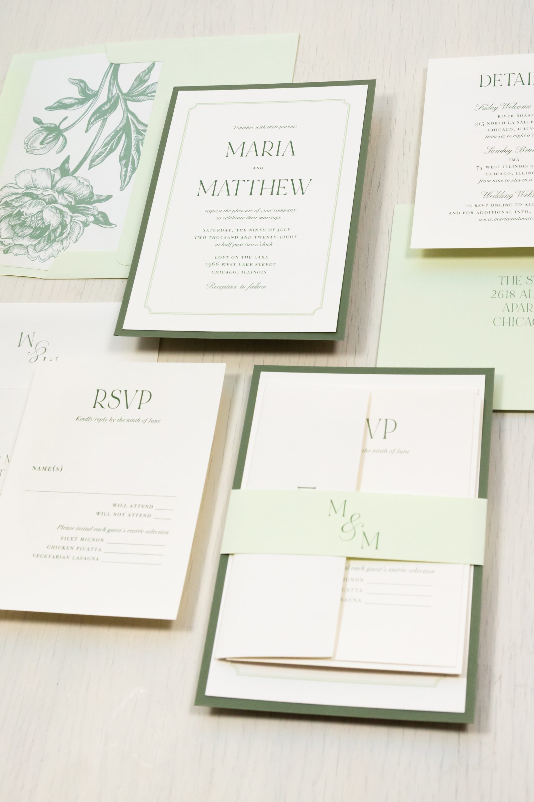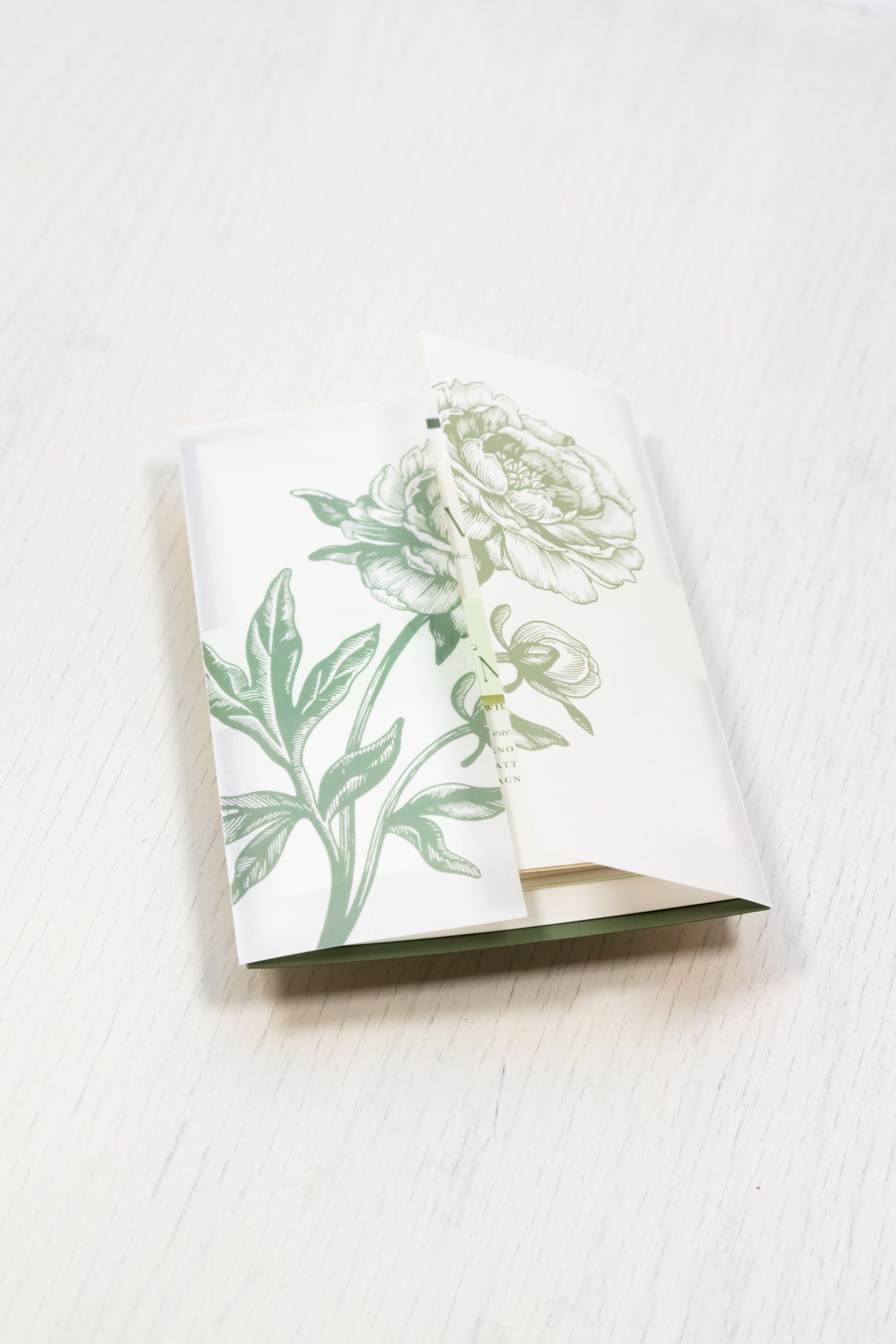 Stylish and modern Olive Peony Invitations with sage envelopes, peony envelope liners and bold fonts. Work with a live designer to customize wording, fonts, materials, and colors until you are 100% happy!