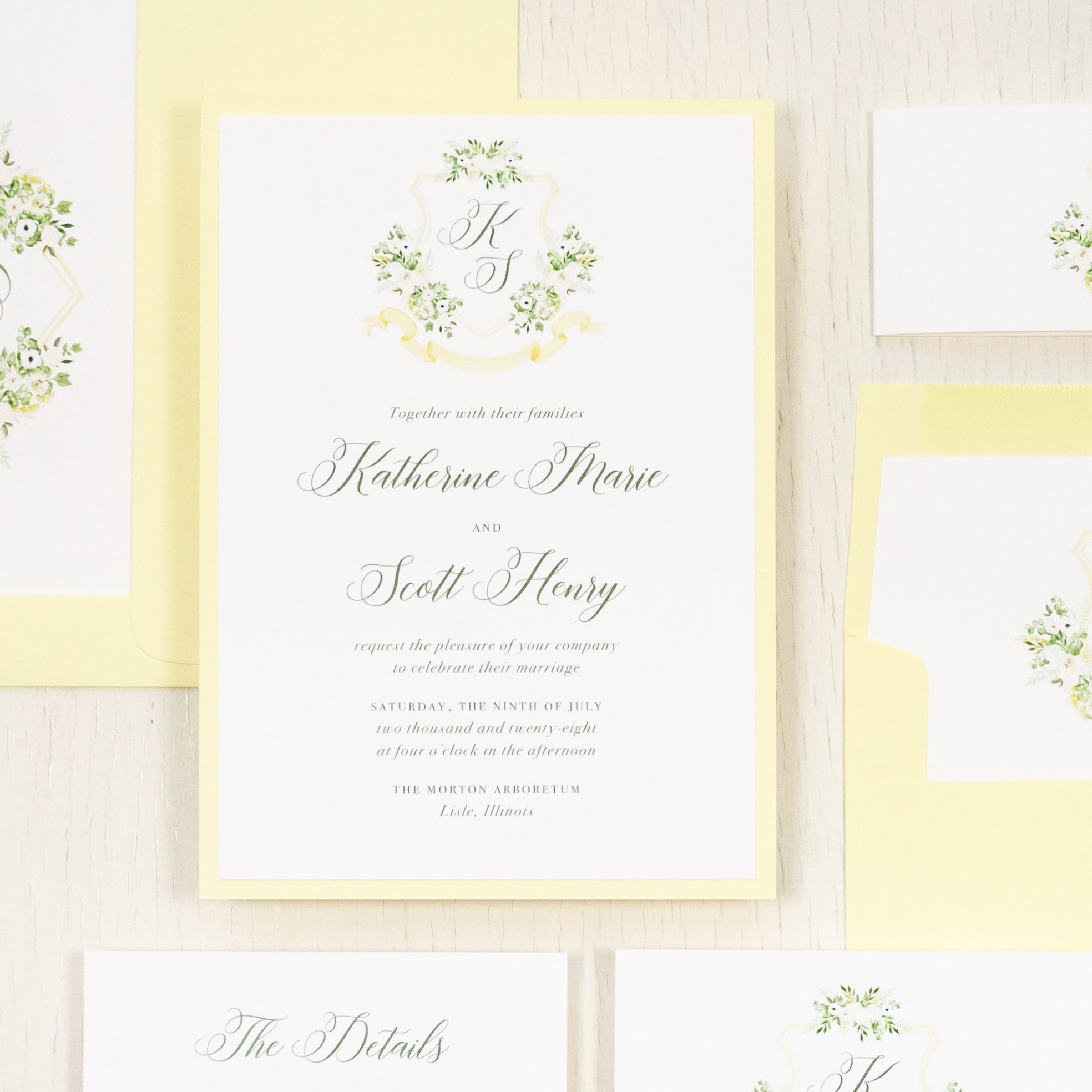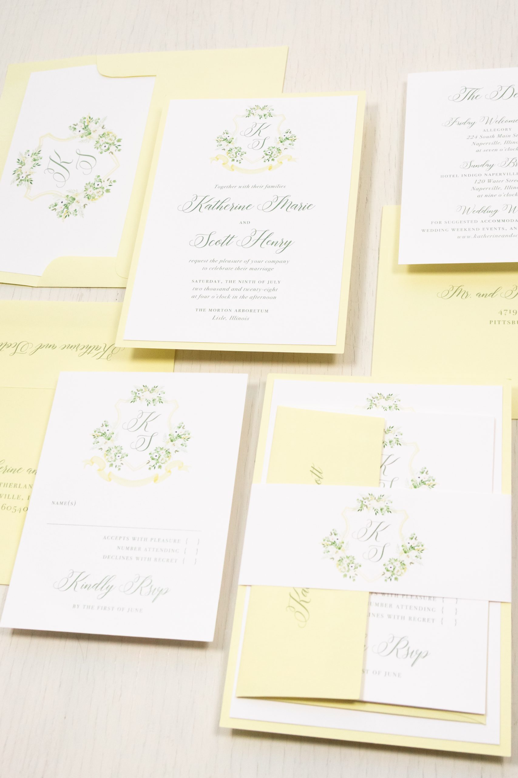 - RSVP envelope liner: pale yellow crest