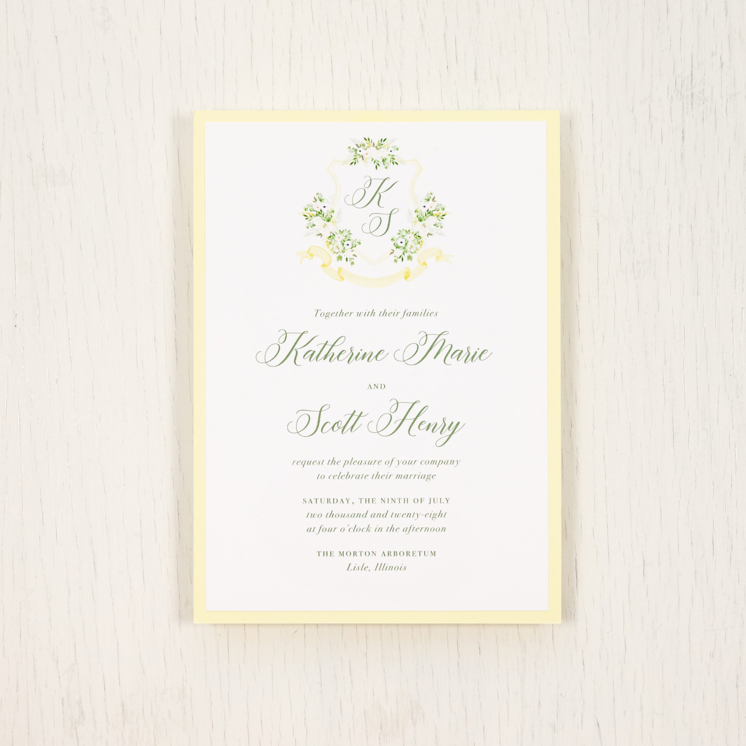 Stylish and modern Pale Yellow Crest wedding invitations with white florals, pale yellow envelopes and formal fonts. Work with a live designer to customize wording, fonts, materials, and colors until you are 100% happy!
