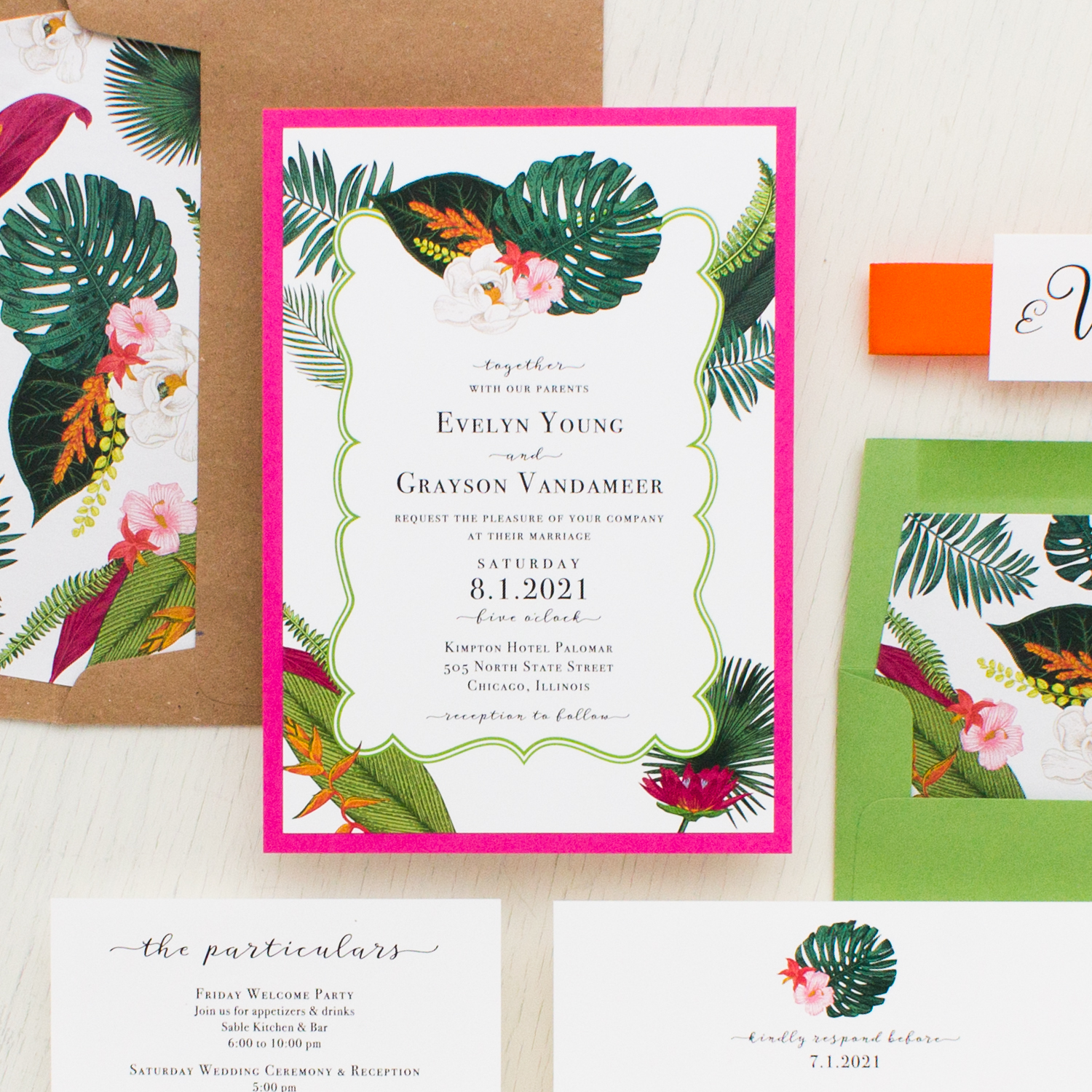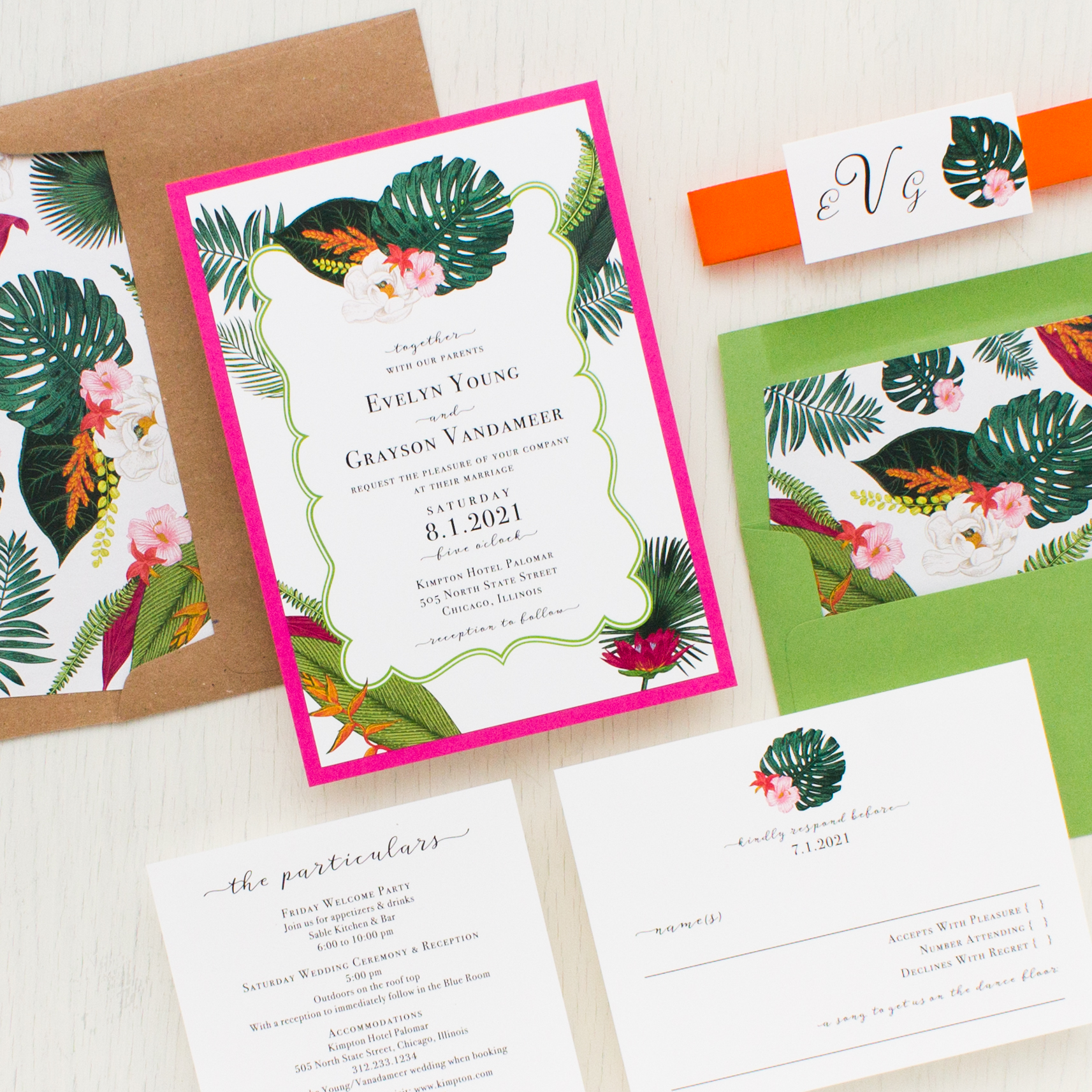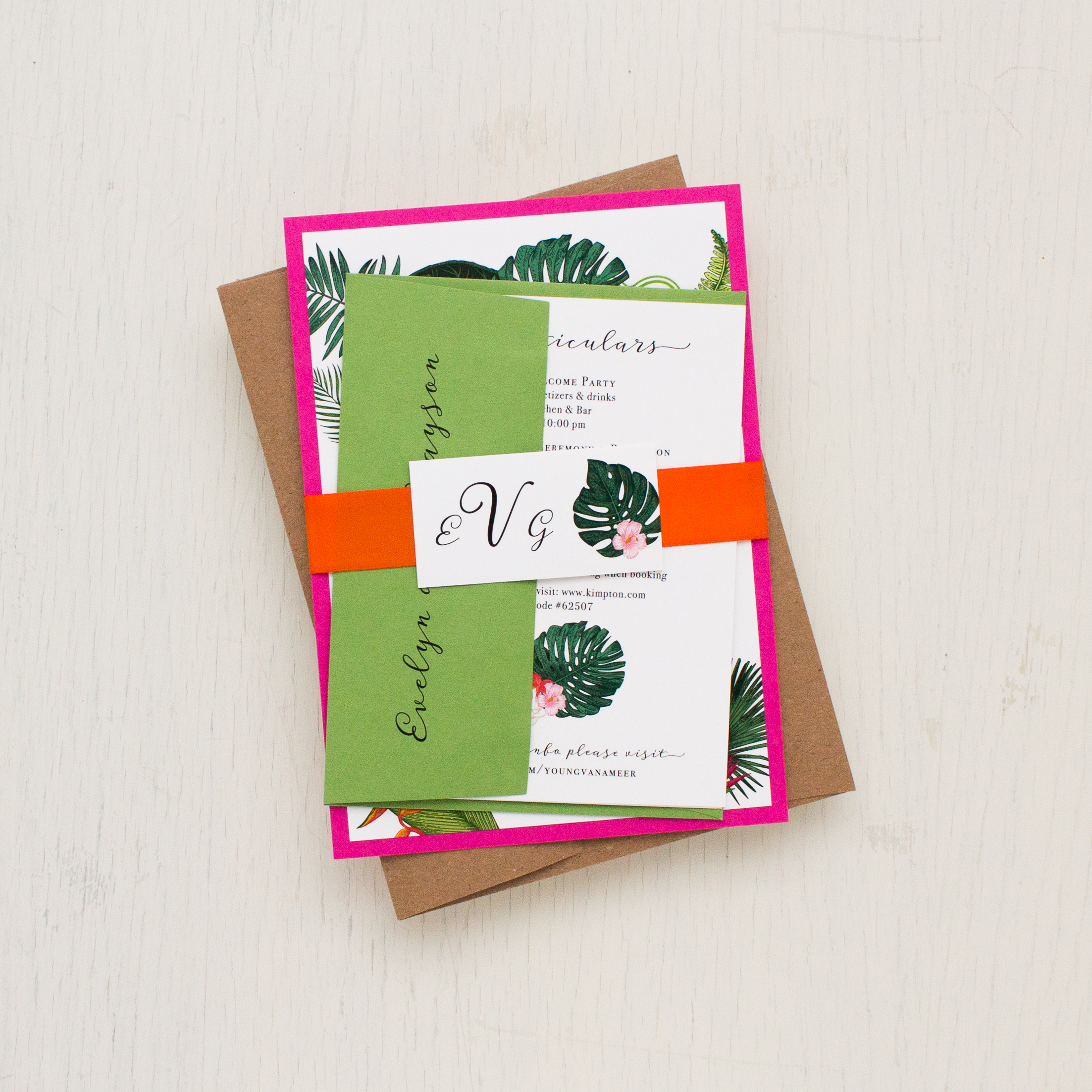 Palm Leaf tropical destination inspired wedding invitations with hot pink, orange, green and kraft. A mix of elegant and easy to read script and serif fonts creates a modern romantic and refined look, perfect for a wedding styled in any season.