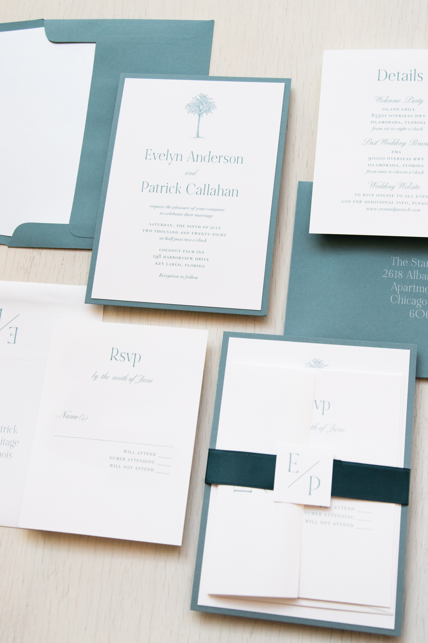 Palm tree wedding invitations layered with modern fonts, seaglass envelopes and bright white paper. Shimmery white envelope liners add a touch of elegance. Modern and sleek, they set a tropical tone for your beach destination wedding.