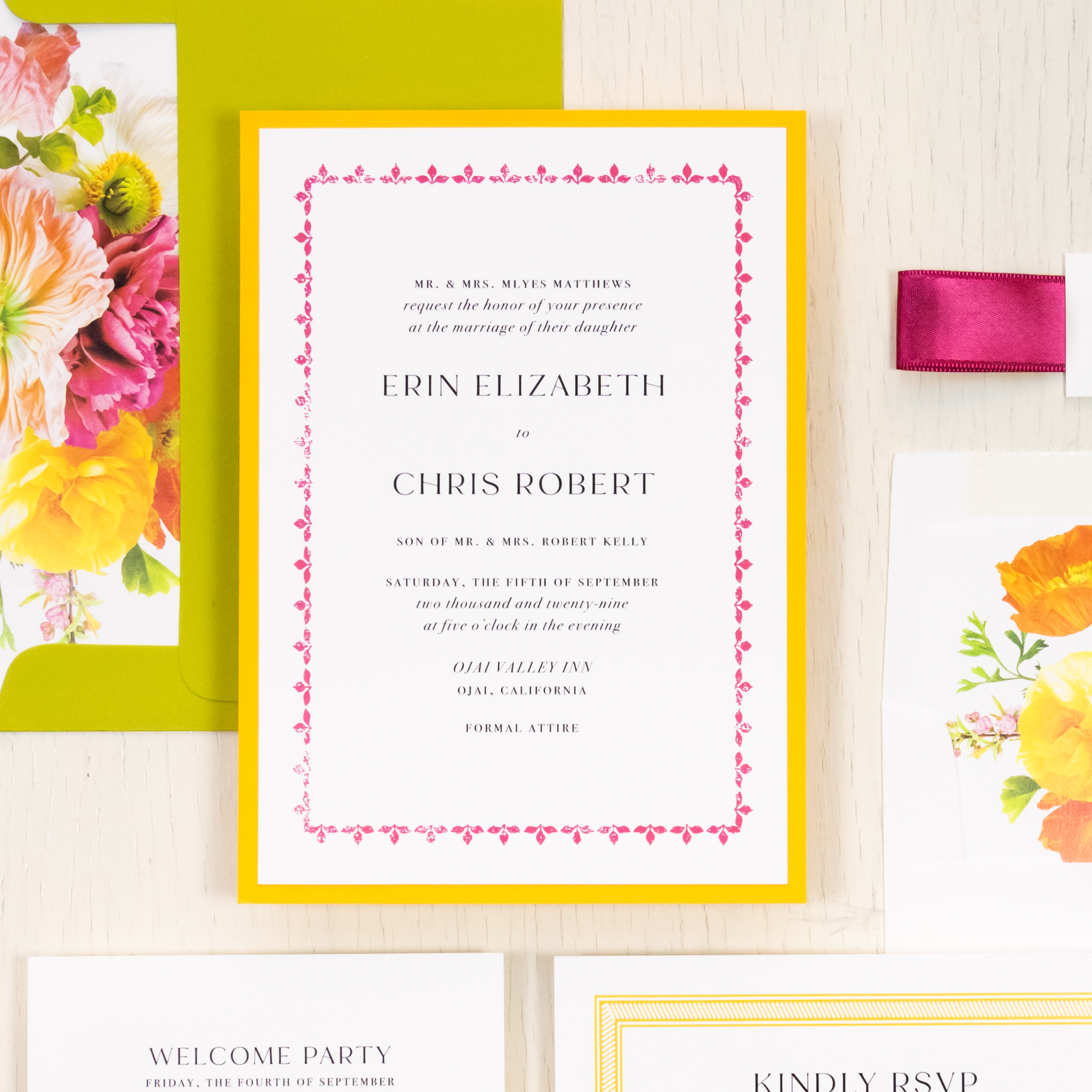 Stylish and modern Poppy Hues Wedding Invitations with chartreuse envelopes, a bright florals and modern fonts. Work with a live designer to customize wording, fonts, materials, and colors until you are 100% happy!