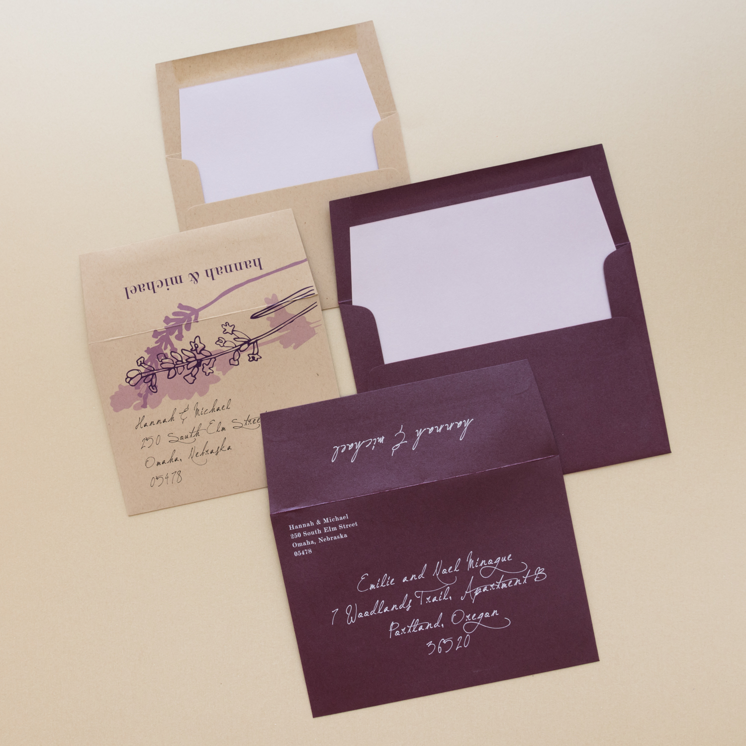 - RSVP envelope liner: pale lilac metallic
