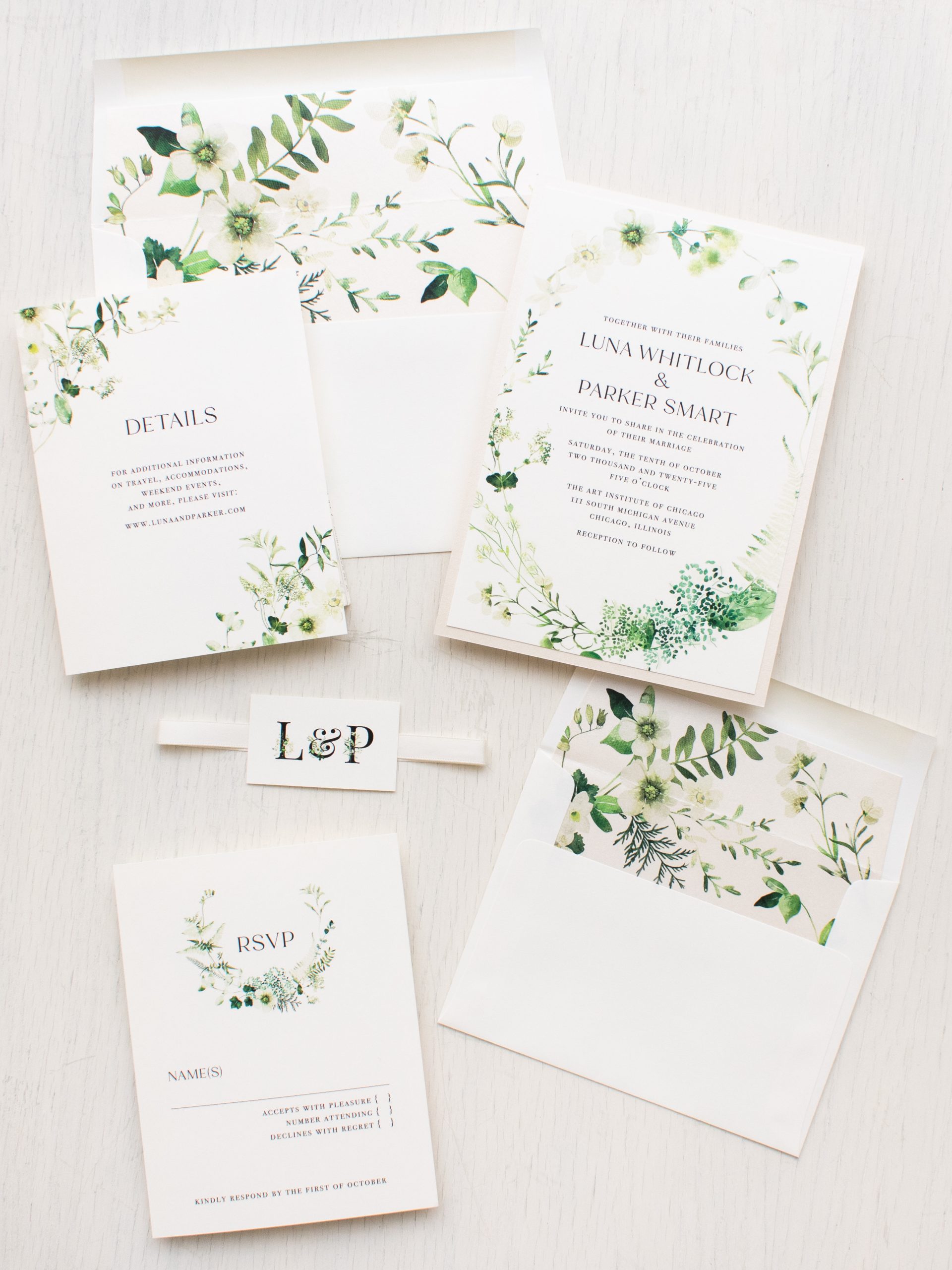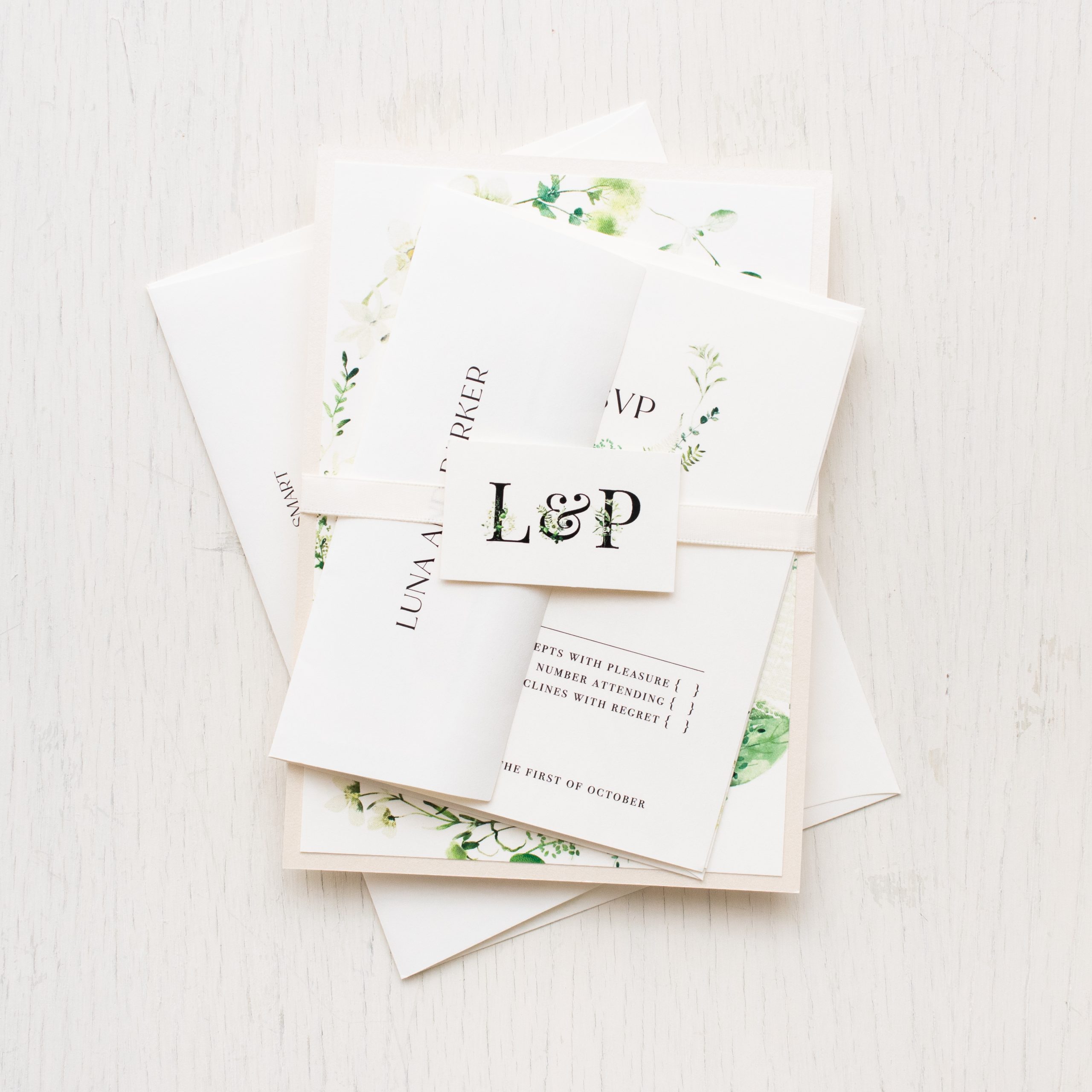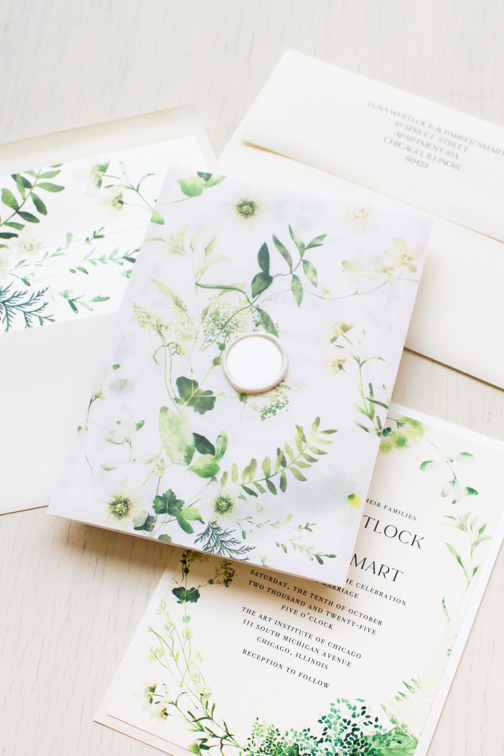 Modern greenery vellum wedding invitations layered with white florals, simple fonts and handcrafted greenery envelope liners. Then, we bundle each set with an ivory satin ribbon and paper tag.