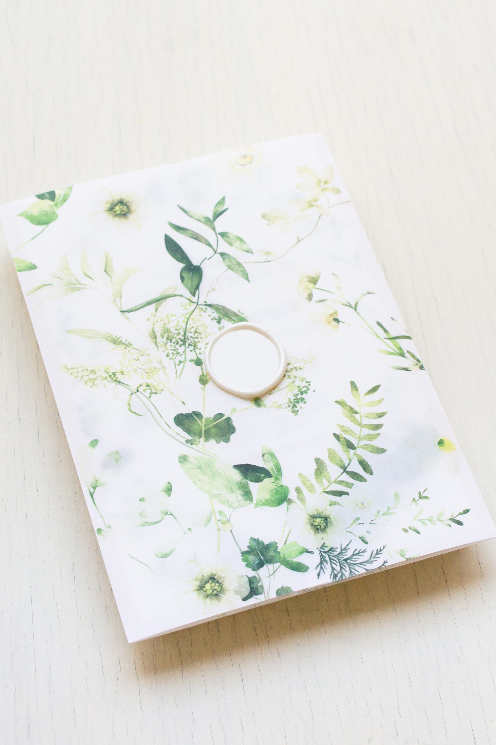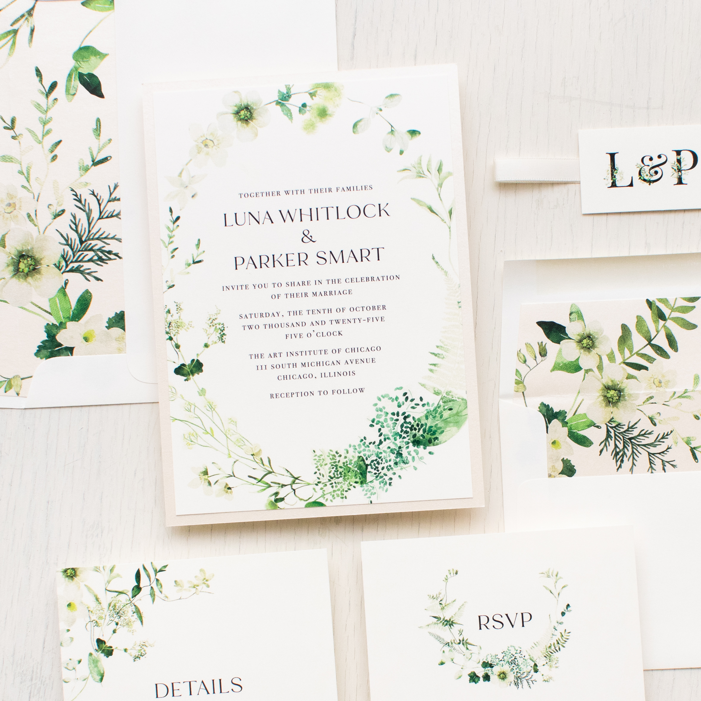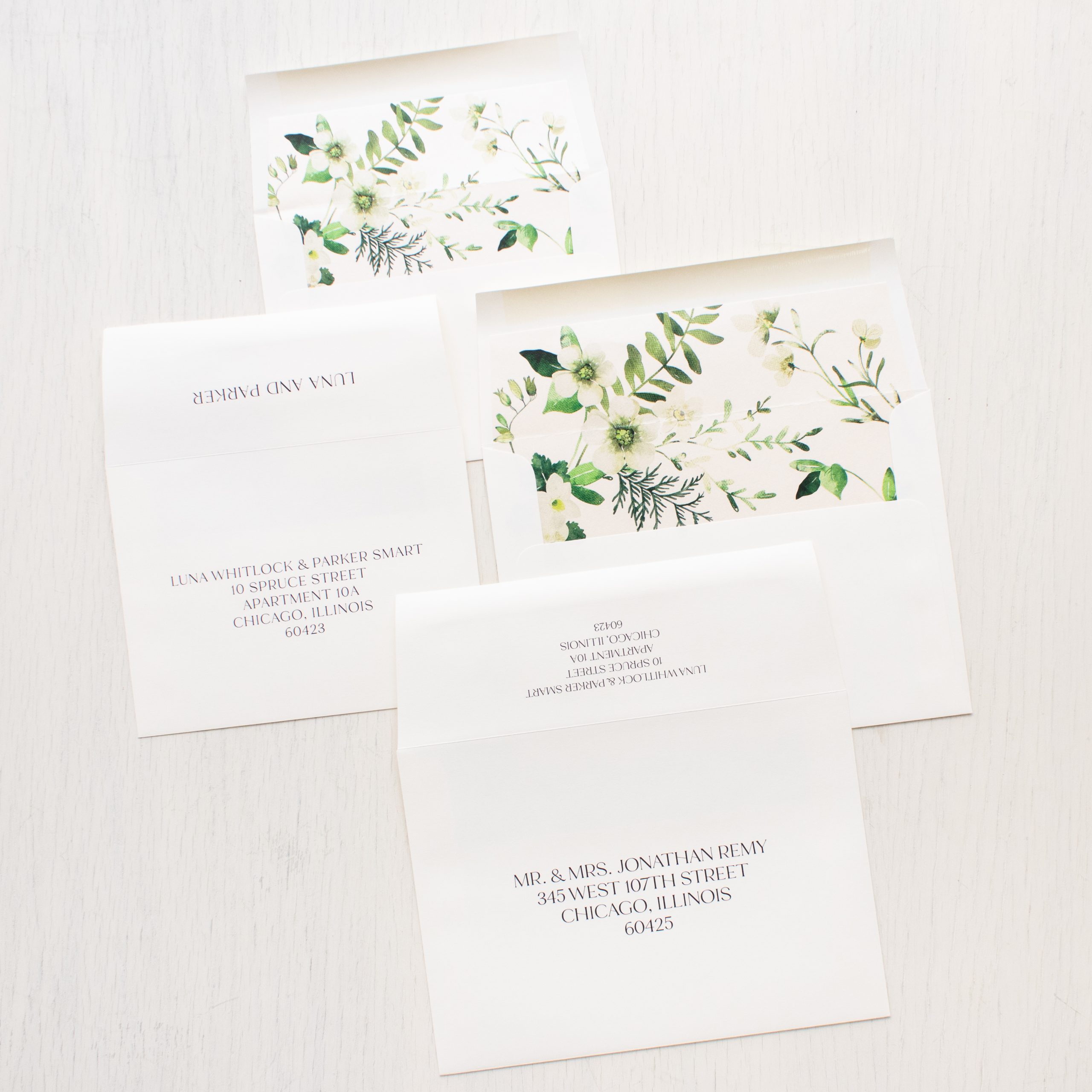 Modern greenery vellum wedding invitations layered with white florals, simple fonts and handcrafted greenery envelope liners. Then, we bundle each set with an ivory satin ribbon and paper tag.