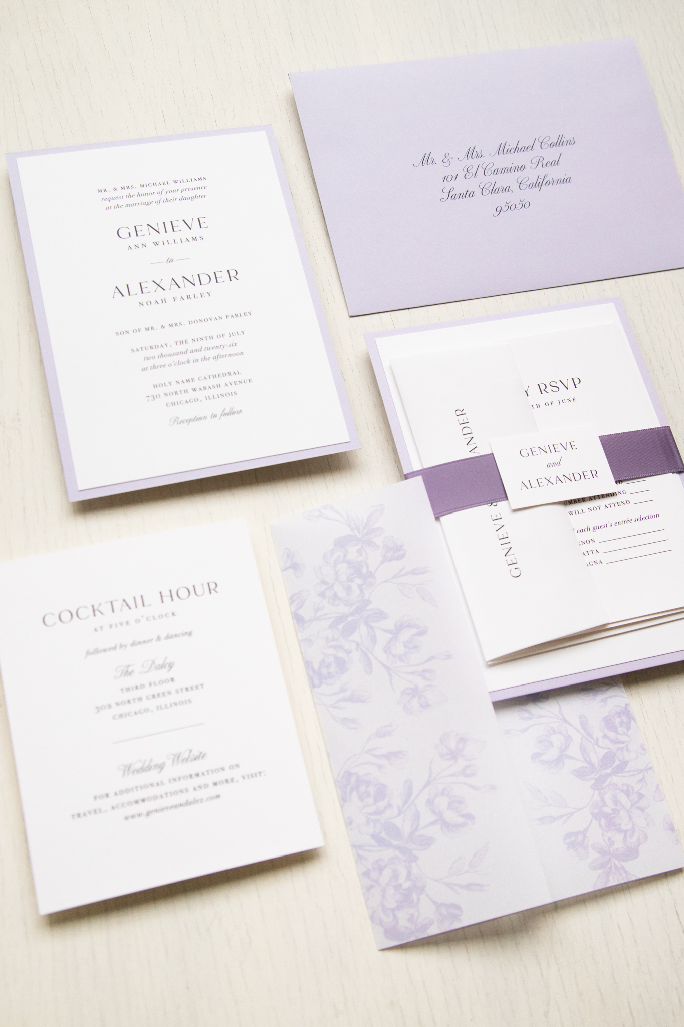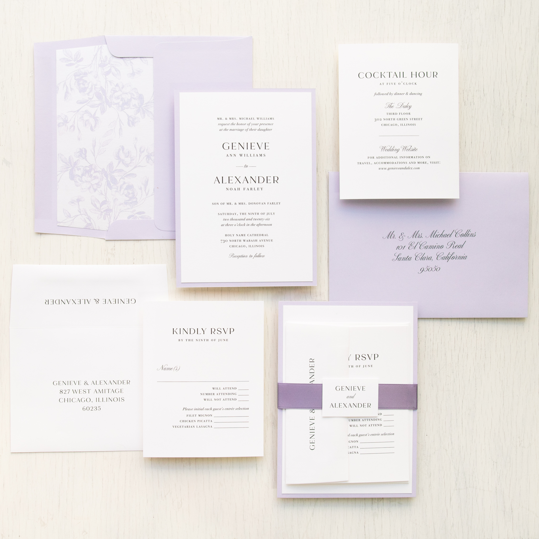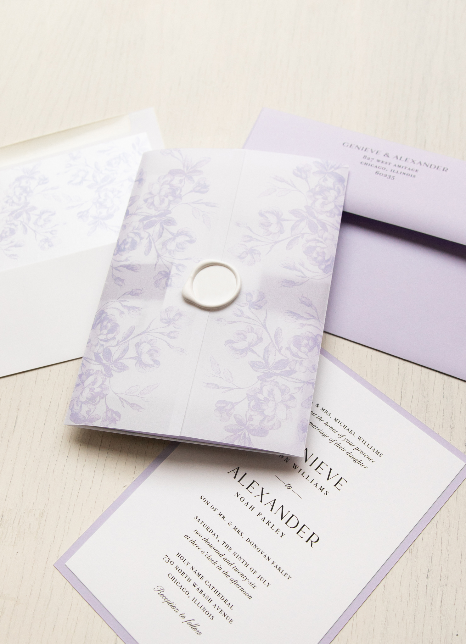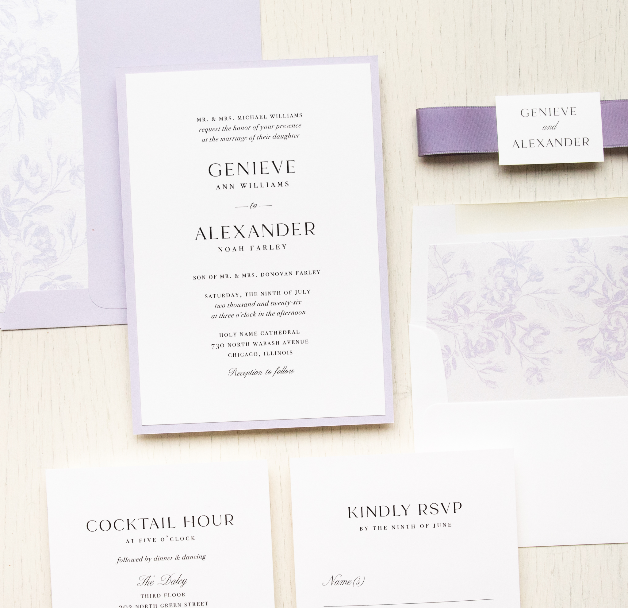 Simple lilac wedding invitations layered with bold fonts, bright white paper and lilac accents. Lilac mailing envelopes and vintage floral envelope liners complete the theme. Simple and minimalist, they set an elegant tone for your classic wedding!