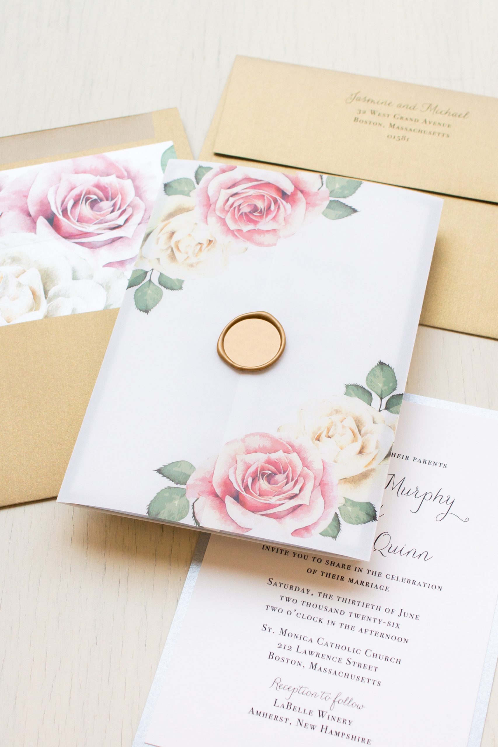Simple mauve floral wedding invitations layered with romantic script fonts, elegant floral envelope liners and bundled with a personalized monogram tag and luxe gold ribbed ribbon.