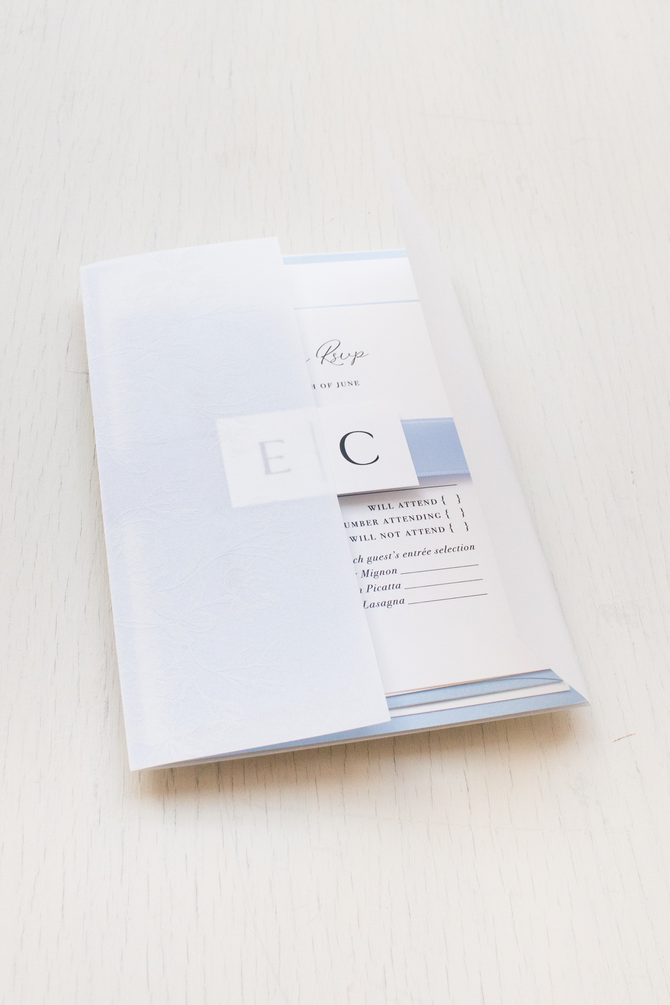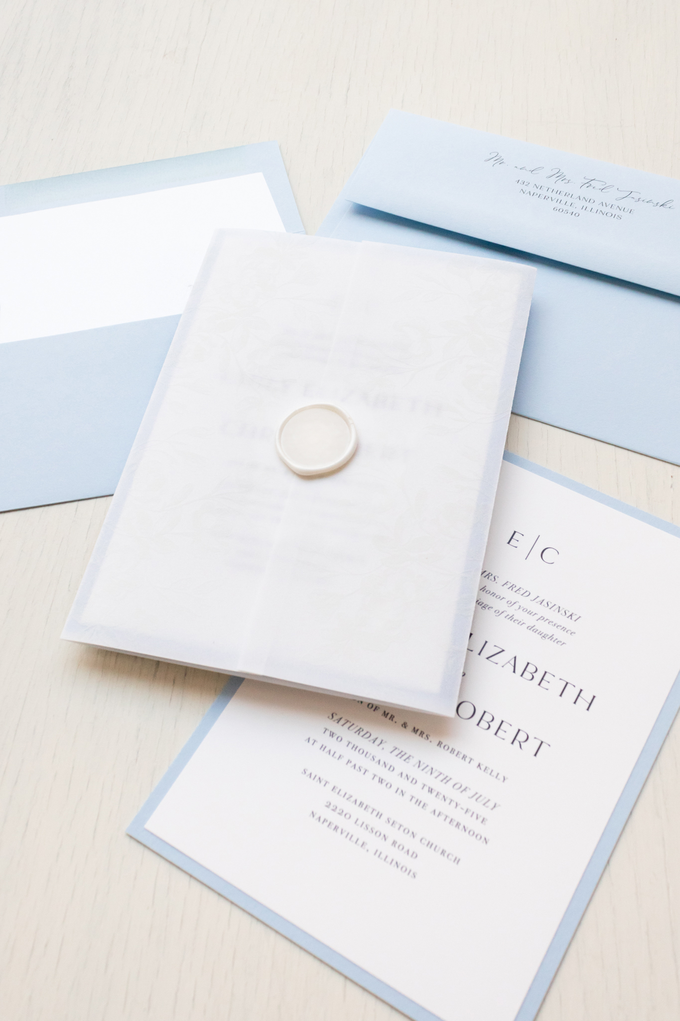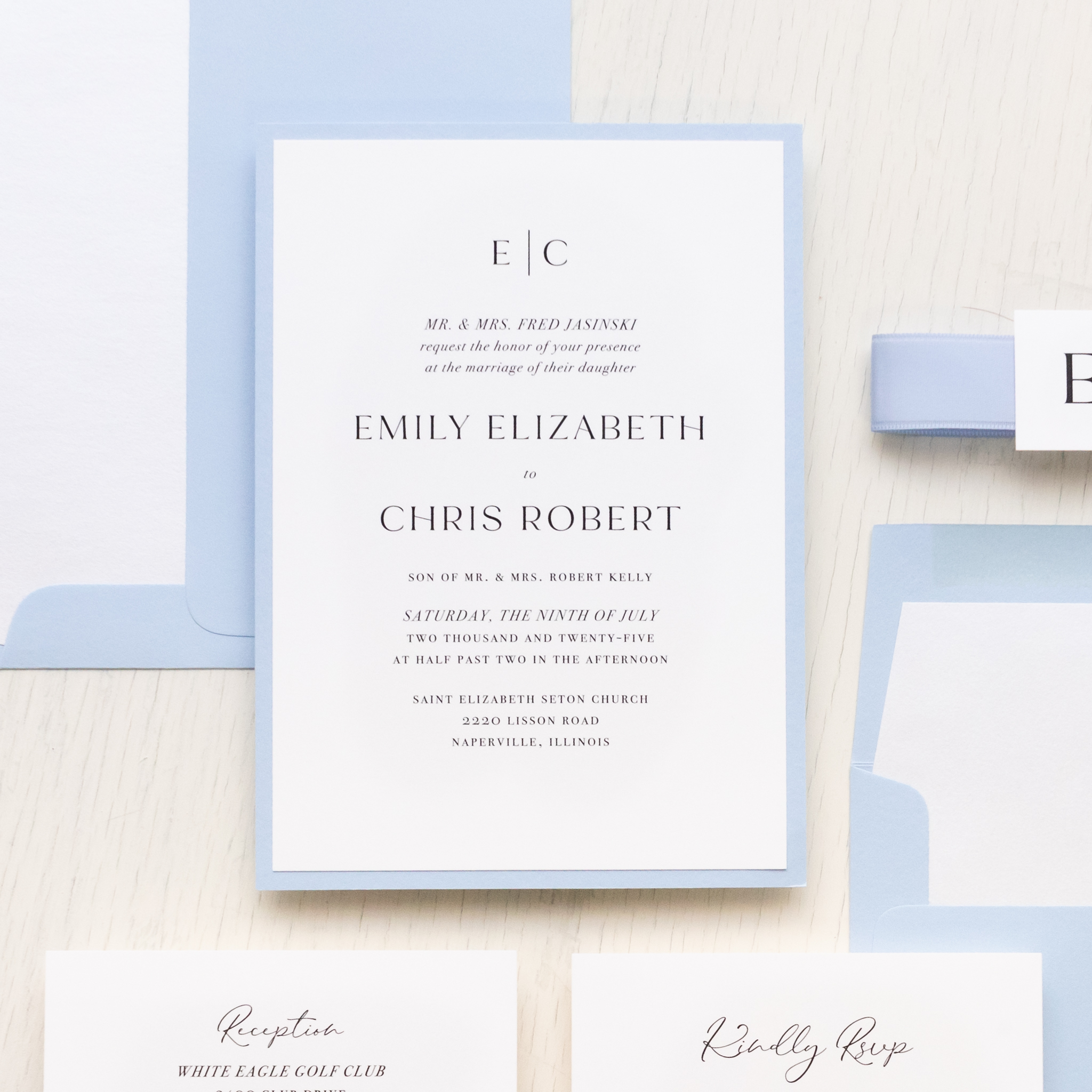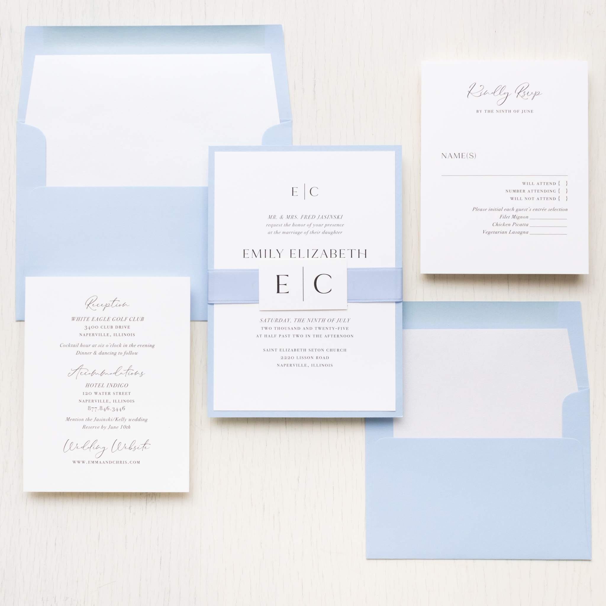 Something Blue wedding invitations layered with modern fonts, pale blue envelopes and bright white paper. White metallic envelope liners add just a touch of elegance. Simple yet classy, they set an elegant tone for your wedding day.