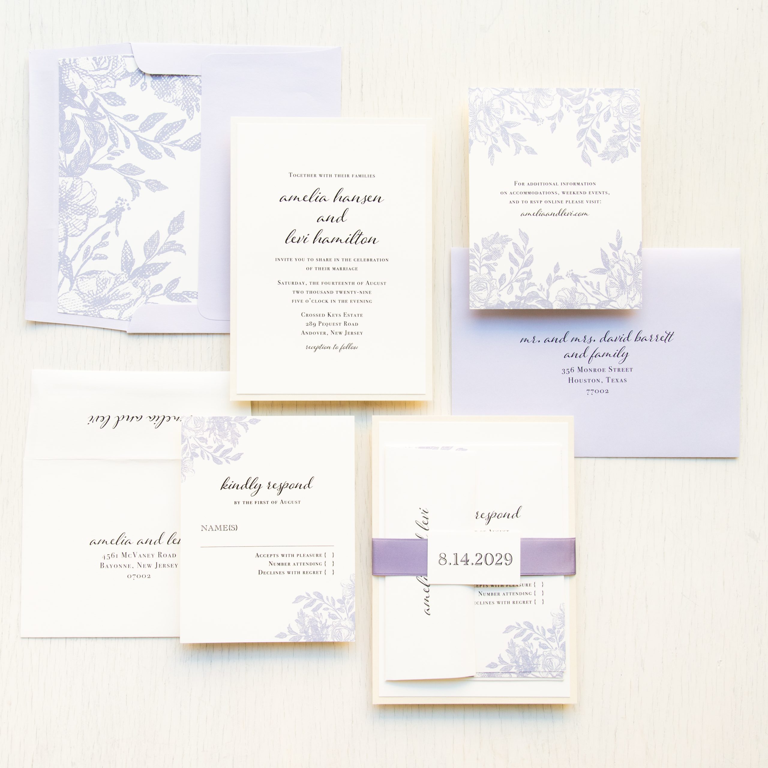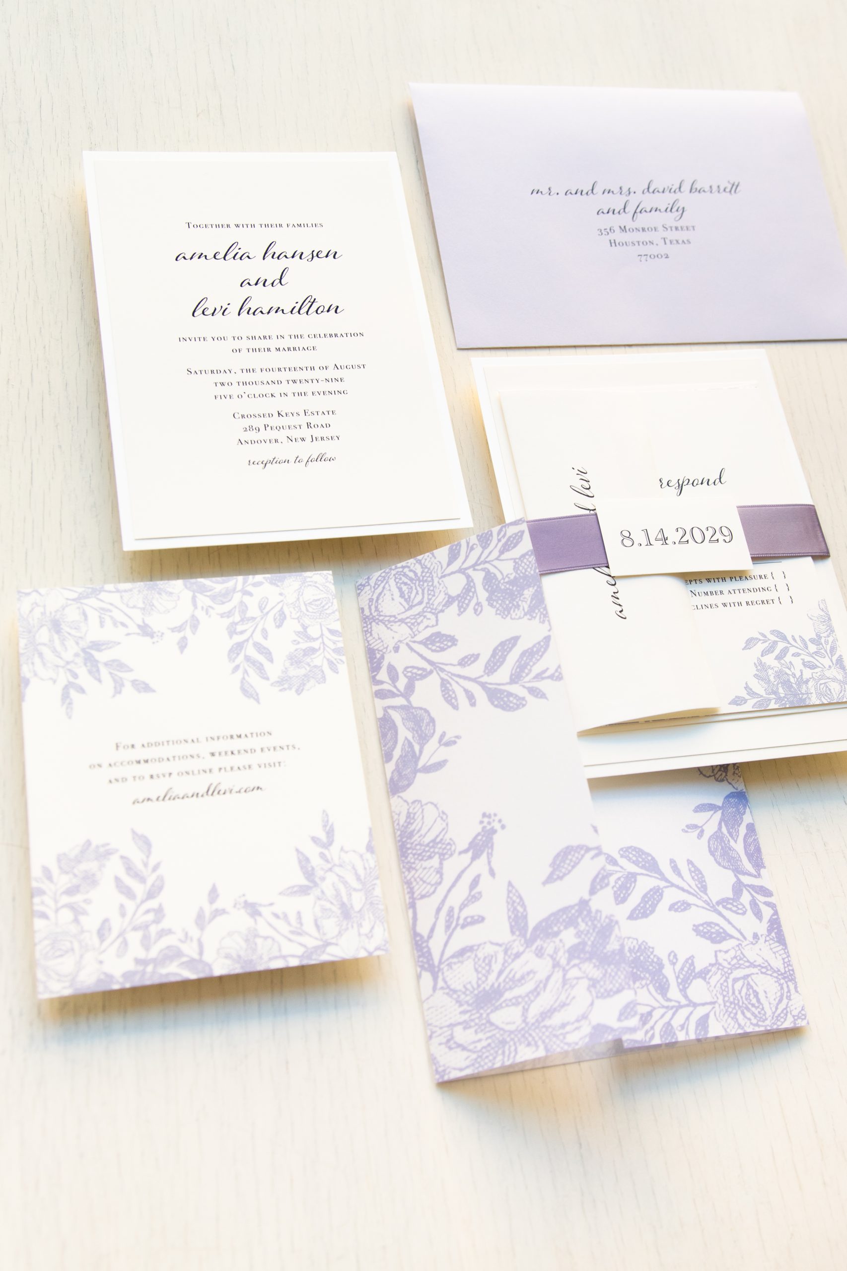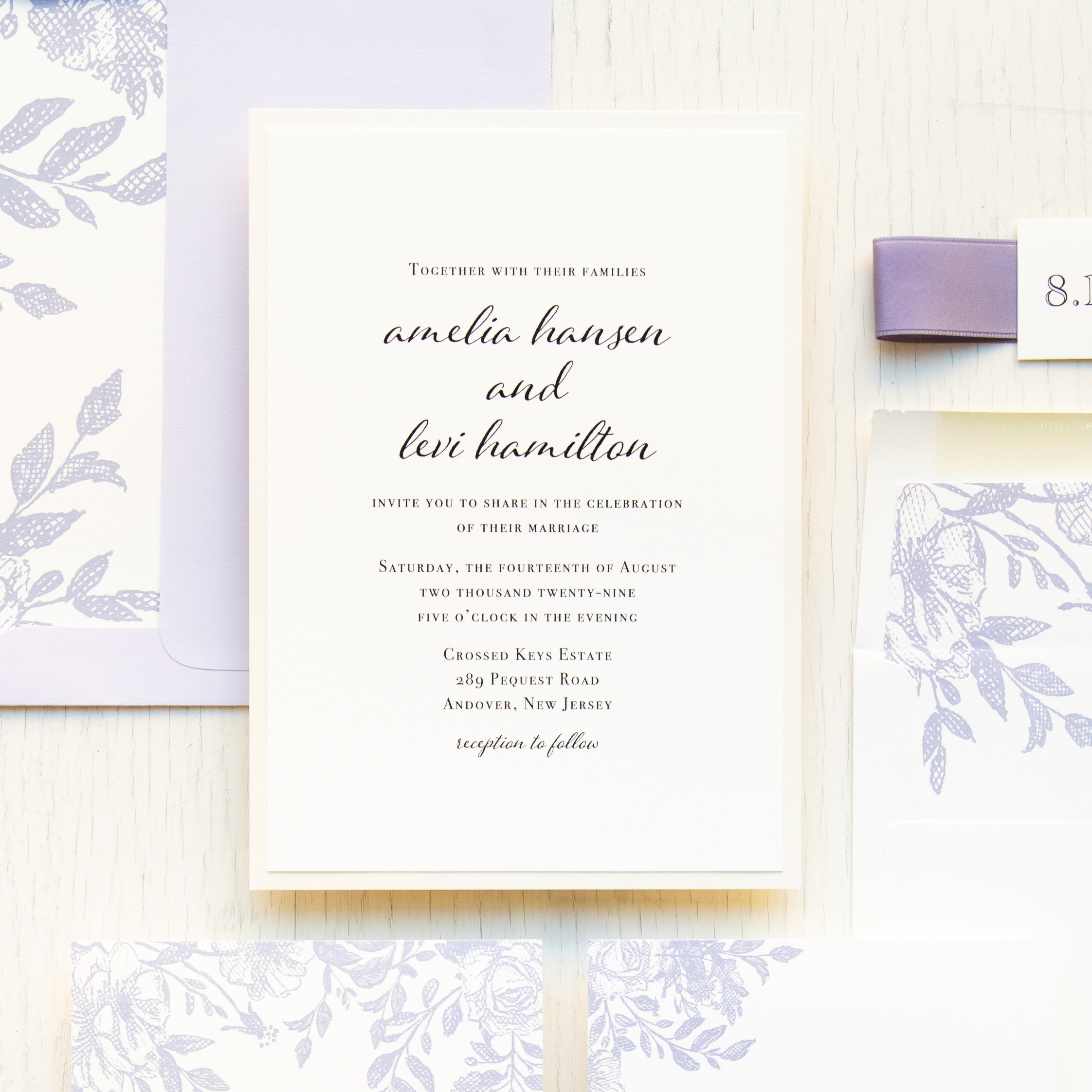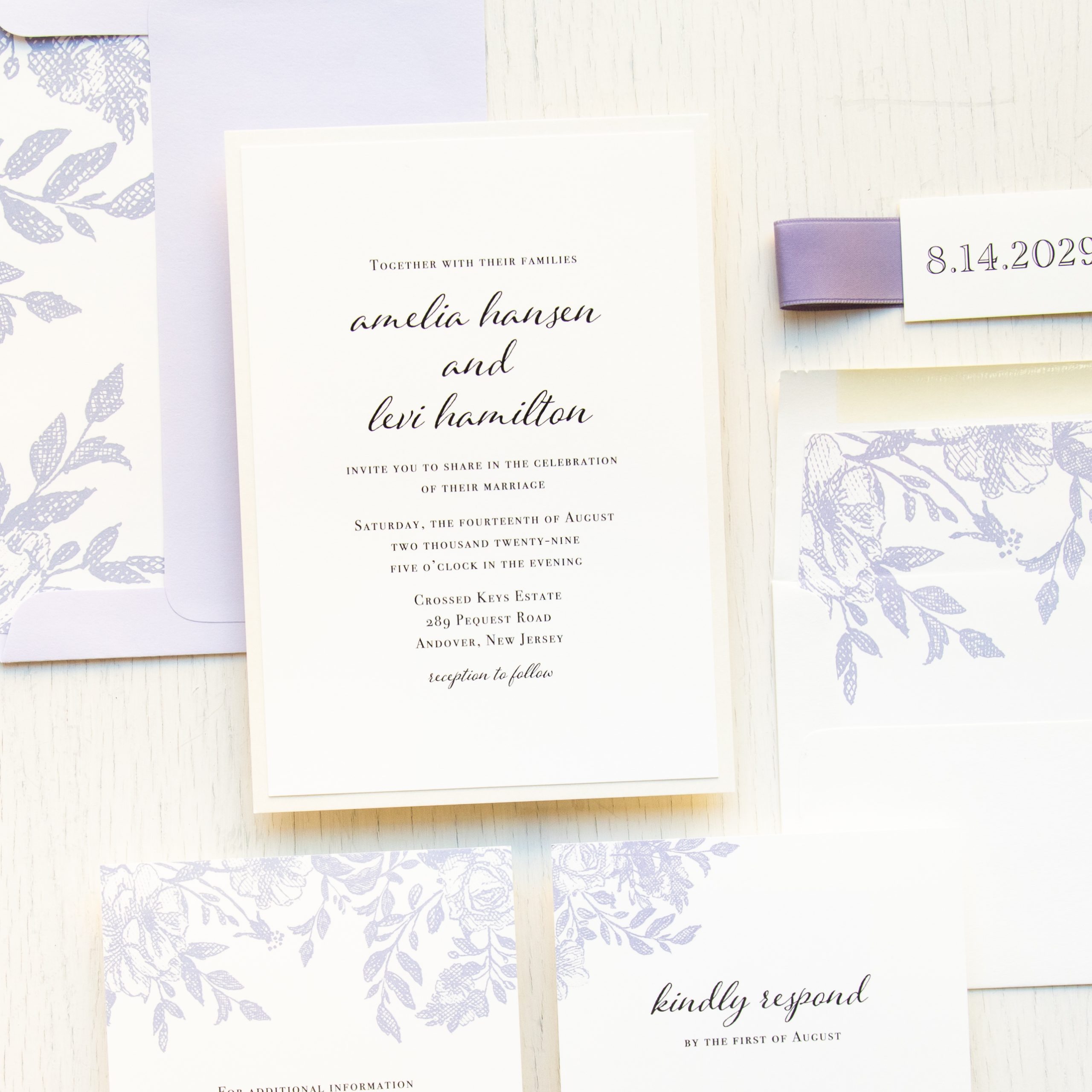 Stylish and modern dusty purple wedding invitations with lilac florals and bold fonts. Work with a live designer to customize wording, fonts, materials, and colors until you are 100% happy!