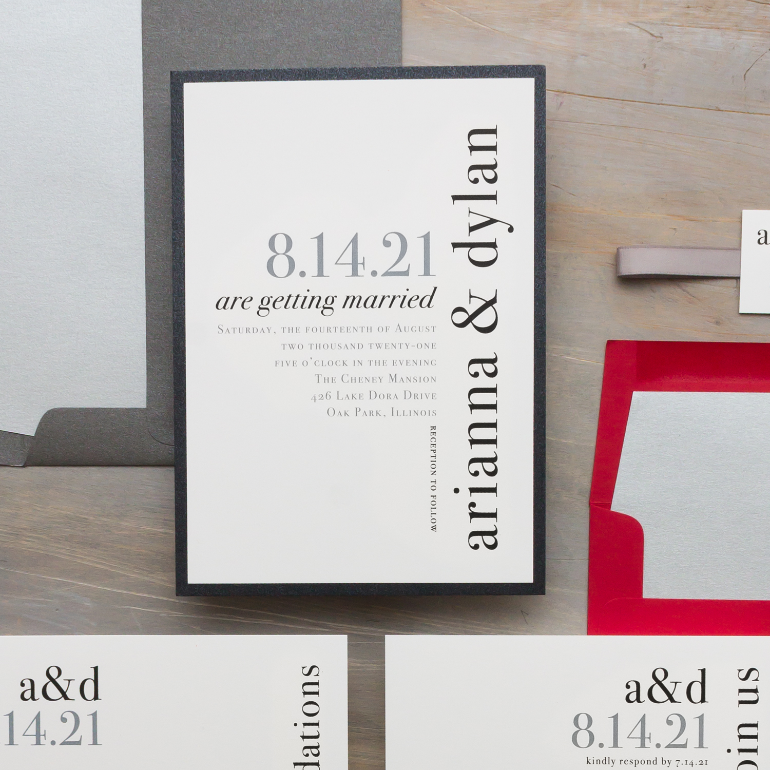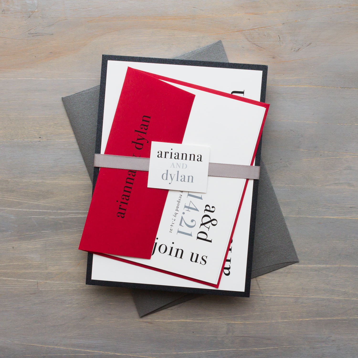 Modern Urban Elegance wedding invitations with black, white & red. Unique typographic details and luxury paper make this invite totally chic!