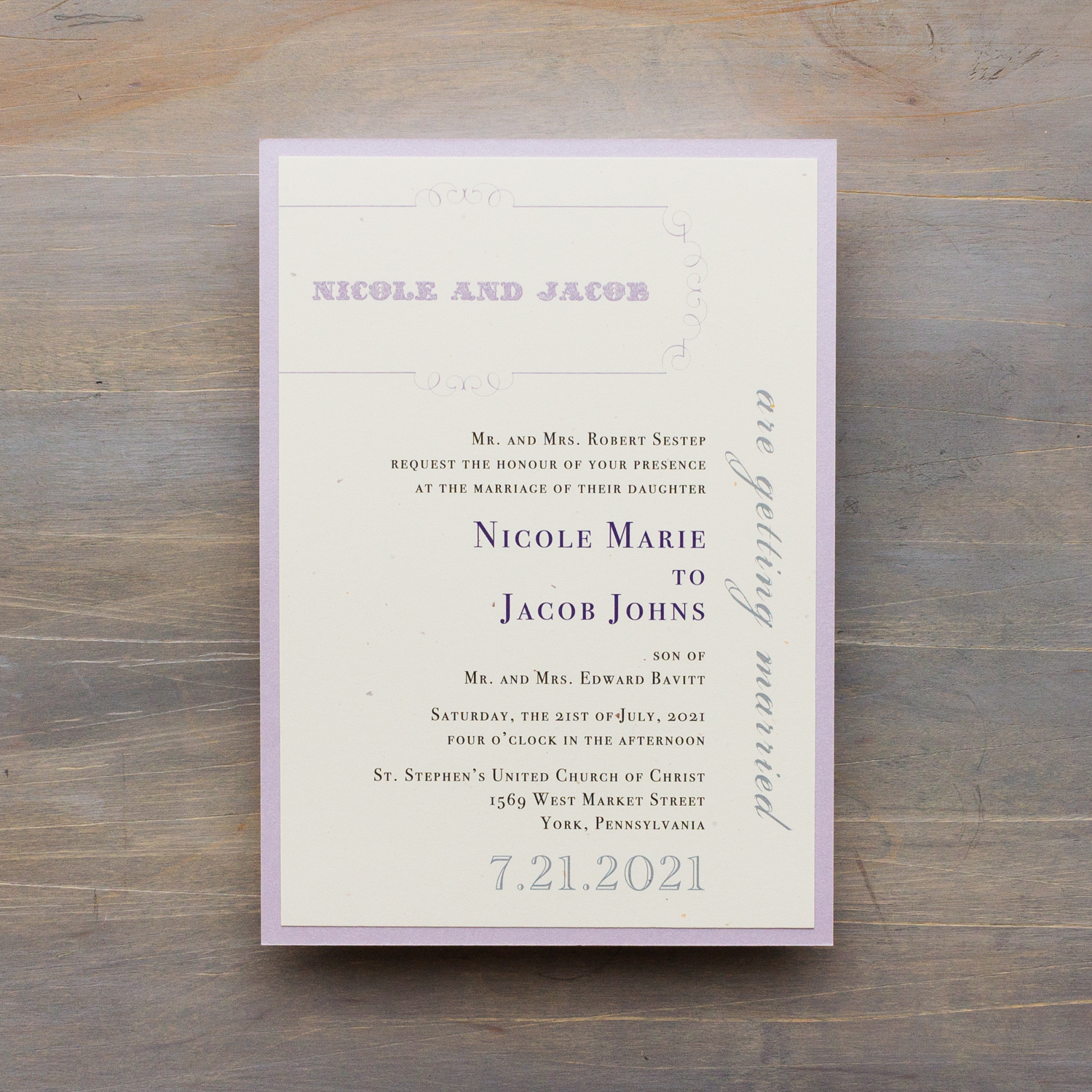 Our vintage purple wedding invitations are shown with upgrades. To calculate pricing, click on the place your order button below.