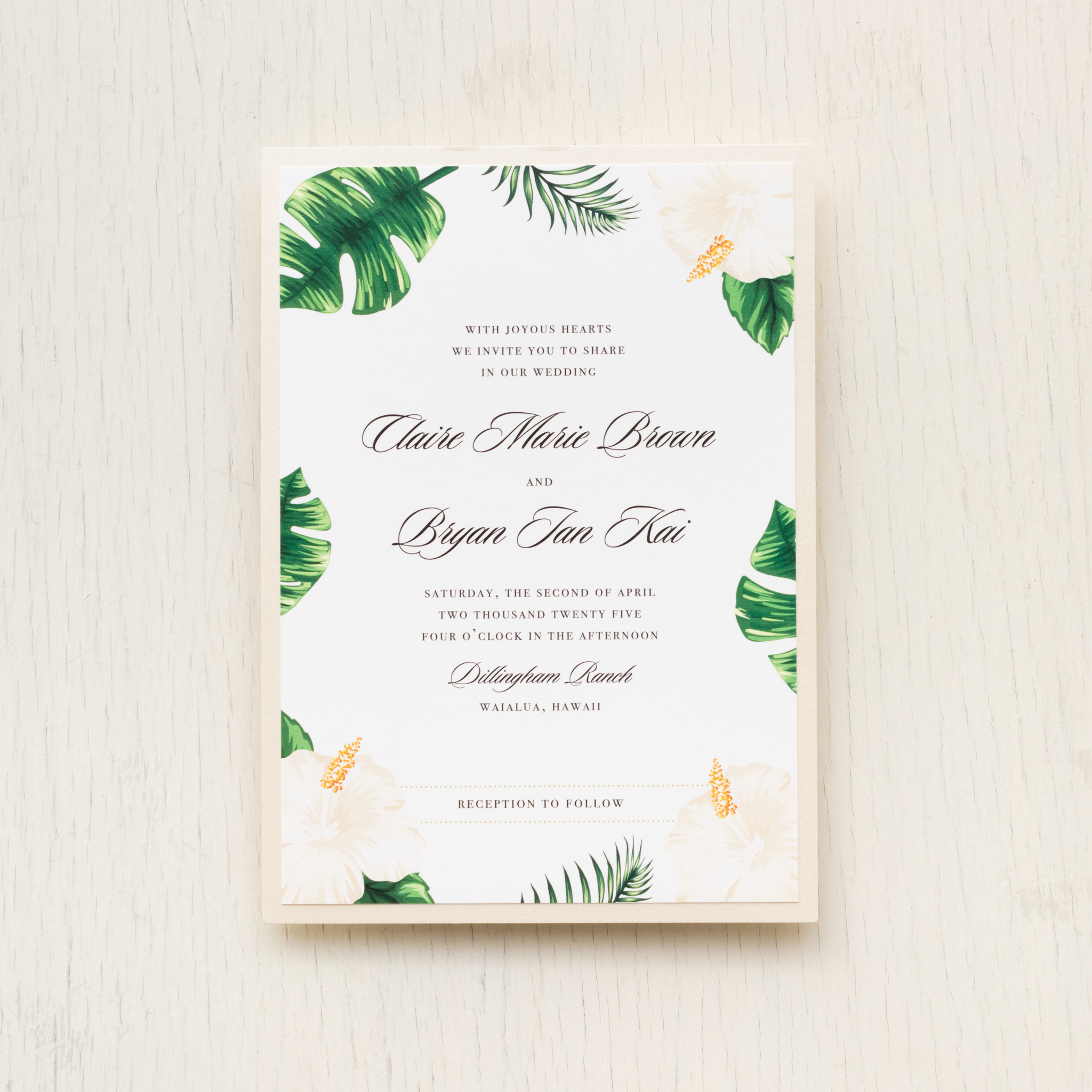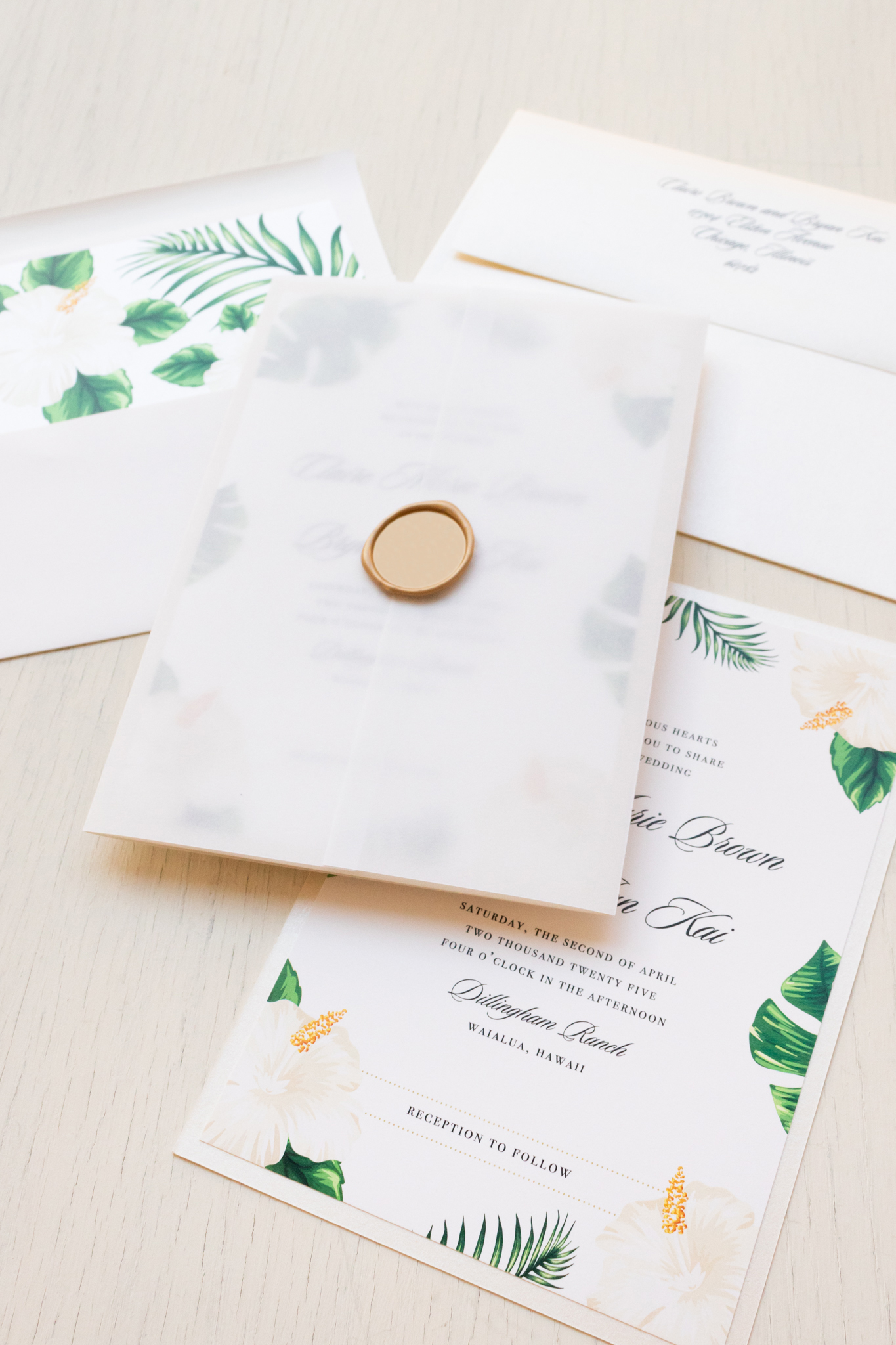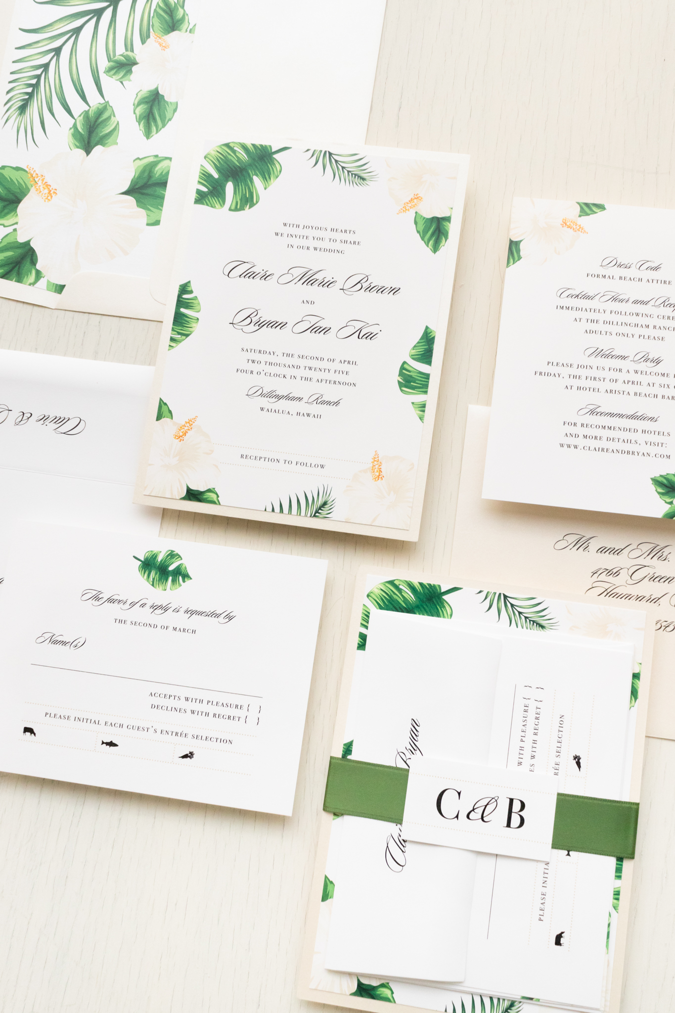 White hibiscus wedding invitations layered with classic fonts, champagne envelopes, white paper and green satin ribbon. Matching envelope liners create a tropical vibe. Hibiscus illustrations set the tone for your Hawaiian destination wedding!