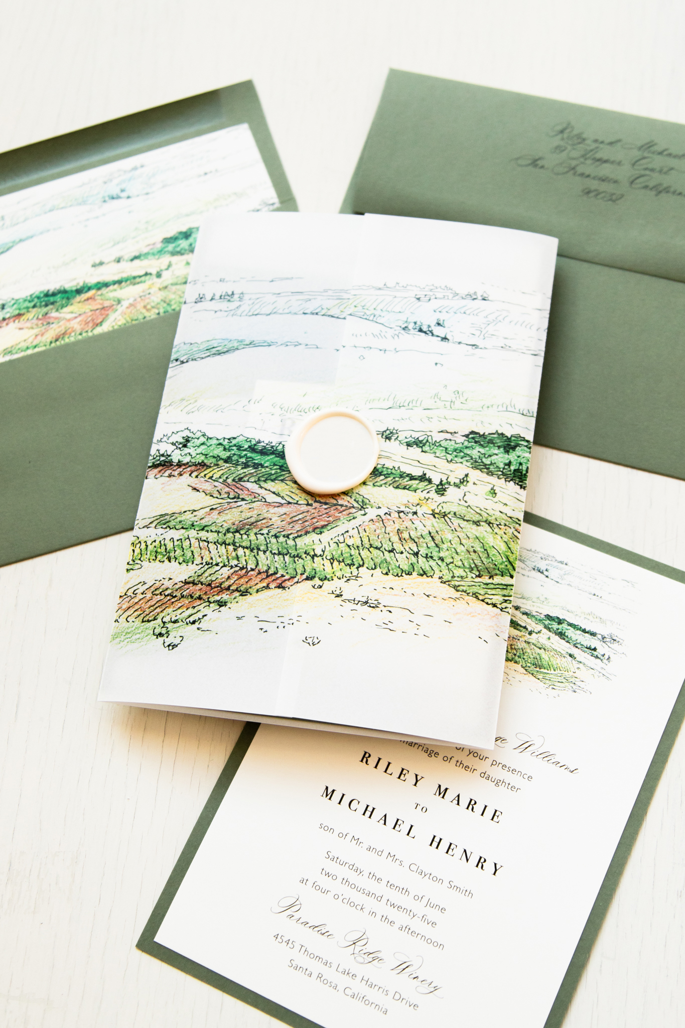 Winery wedding invitations layered with elegant fonts, olive envelopes and soft ivory paper. Vineyard envelope liners complete the look. Modern yet classy, they set an elegant tone for your winery wedding.